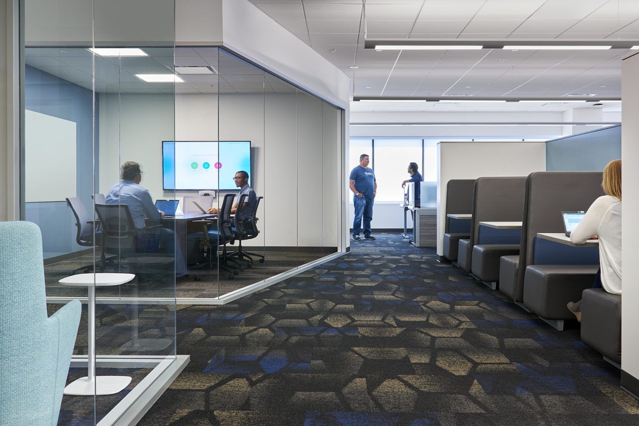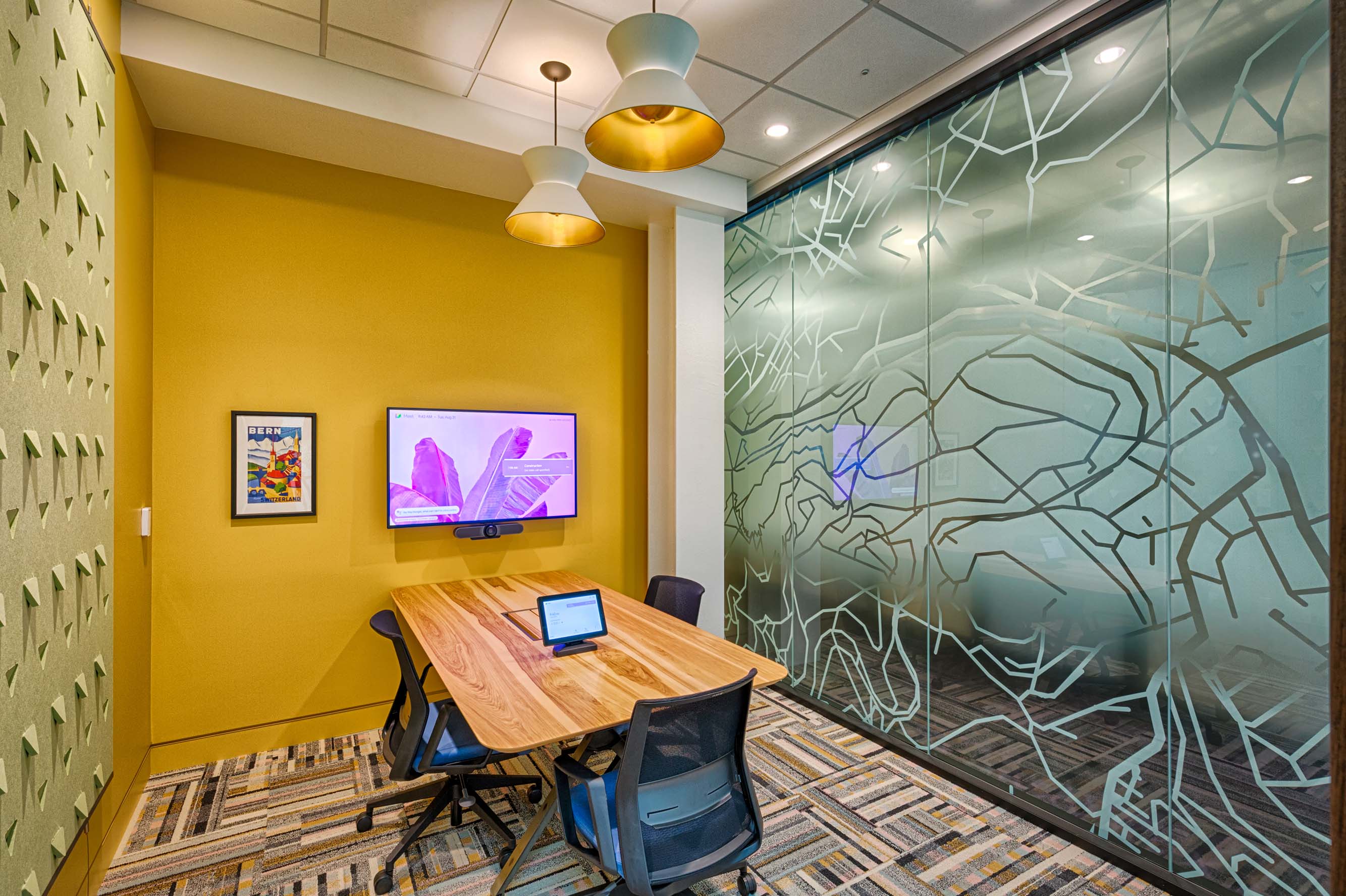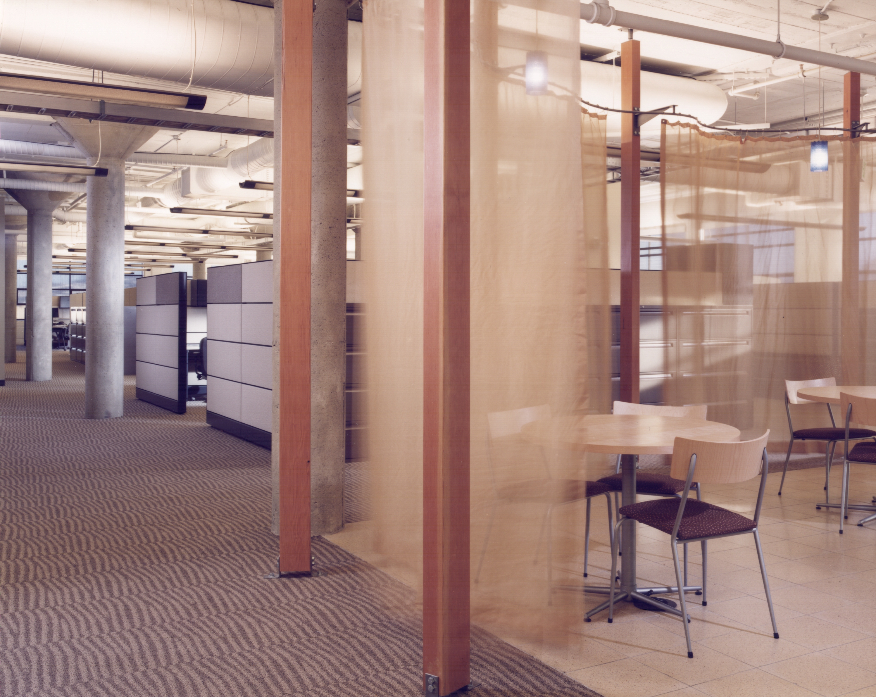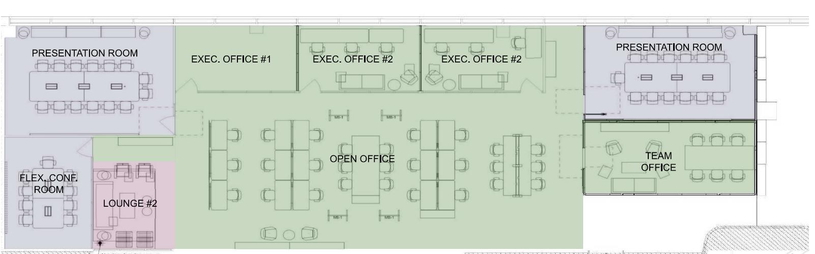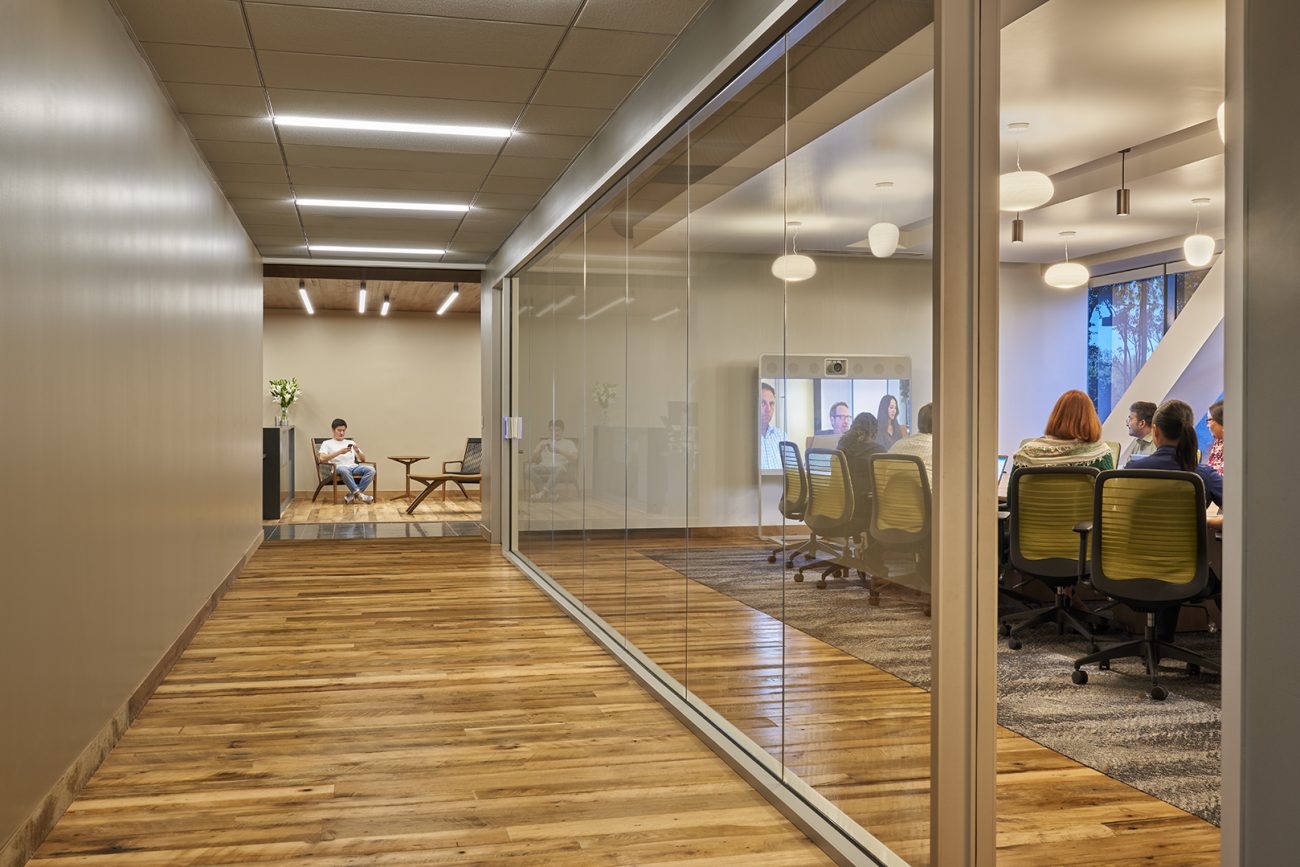 A renovation of a tech company executive suite to be organized based on new team structures and ways of working together. Creating shared offices, different types of conference rooms and casual space, plus using furniture and architectural elements to screen off areas for more privacy.