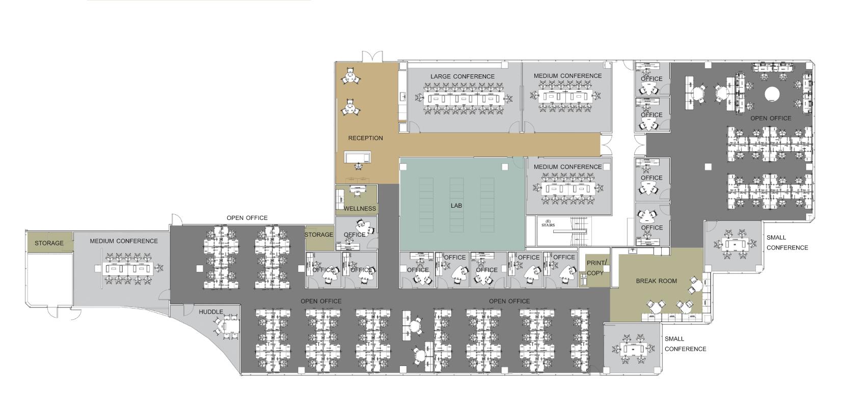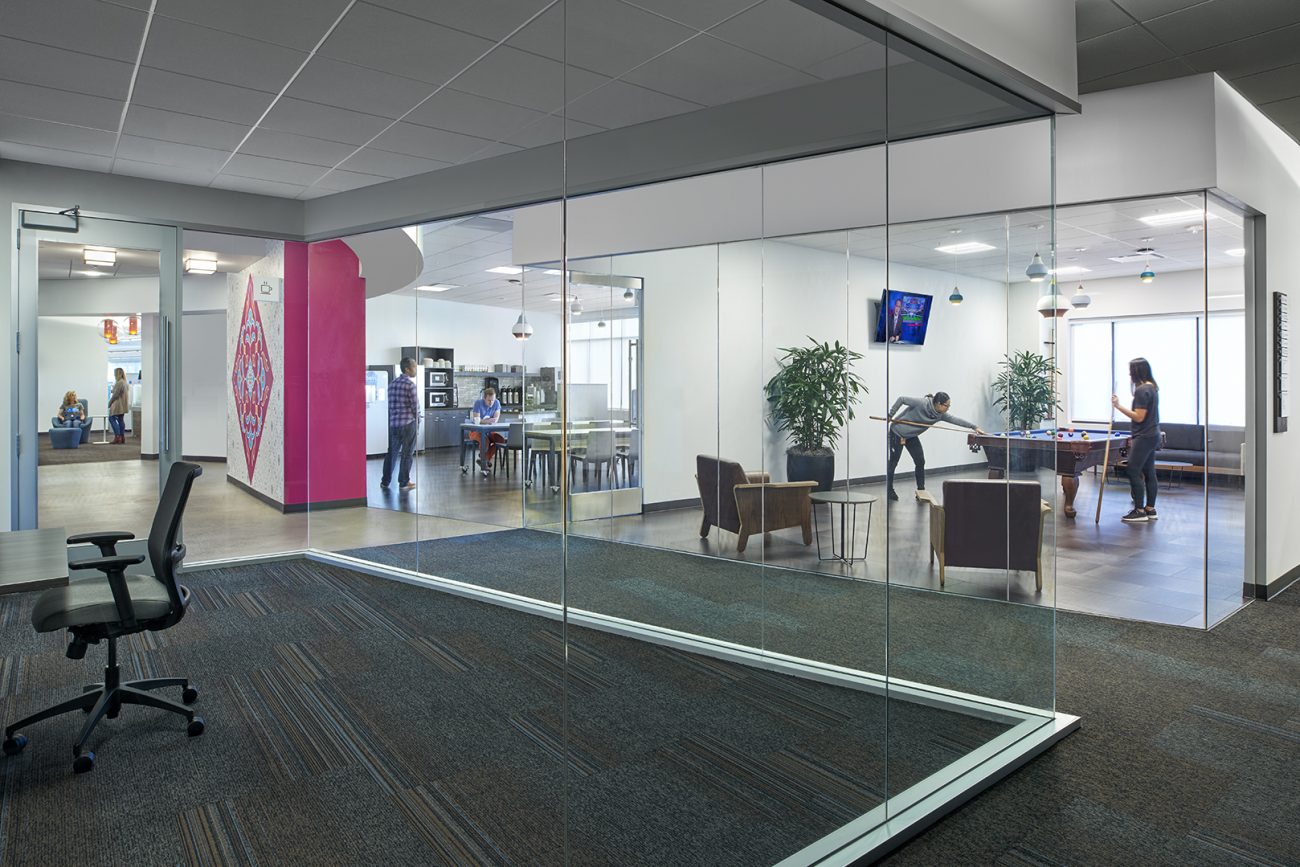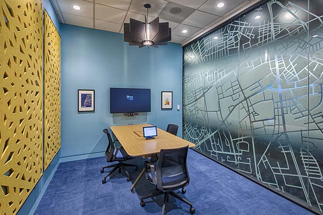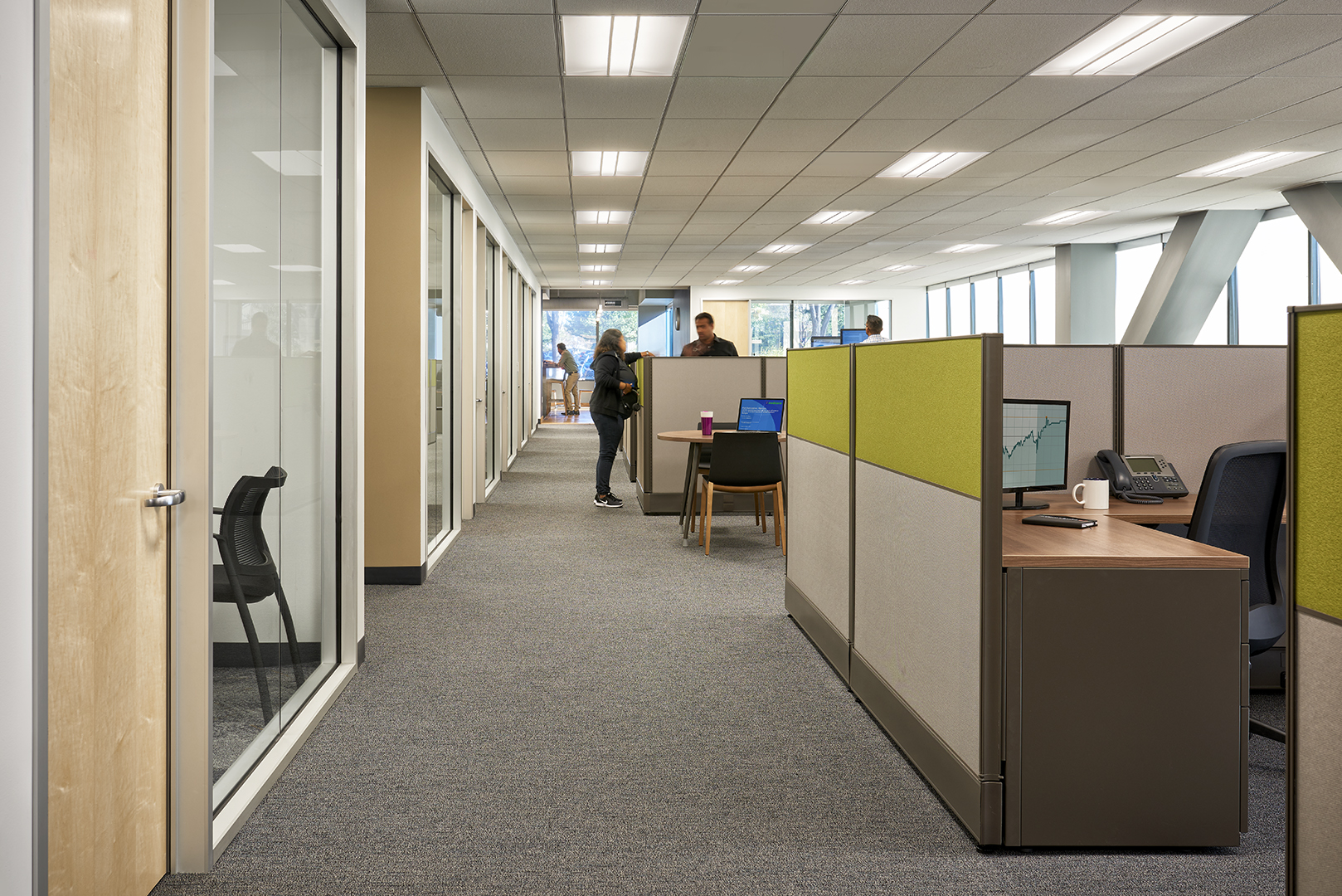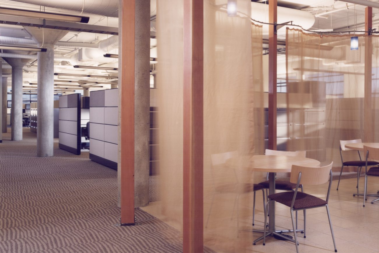 A renovation of a tech company executive suite to be organized based on new team structures and ways of working together. Creating shared offices, different types of conference rooms and casual space, plus using furniture and architectural elements to screen off areas for more privacy.