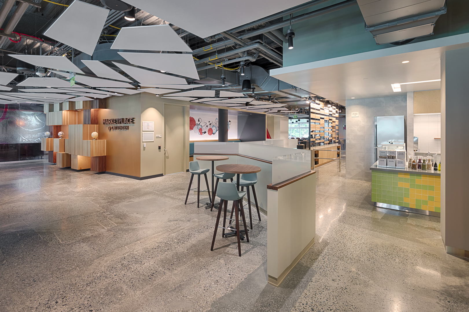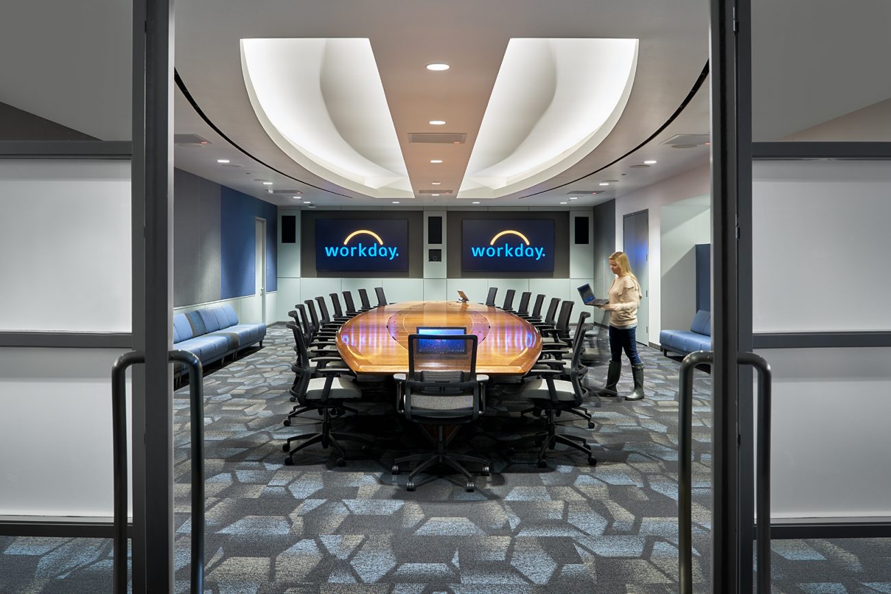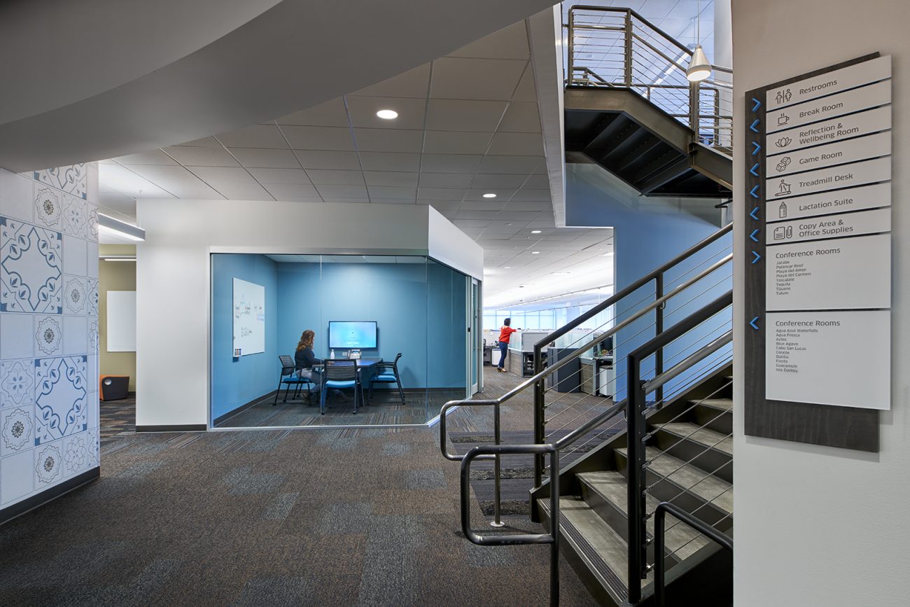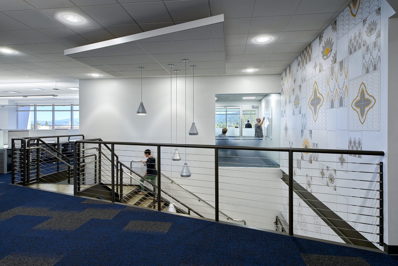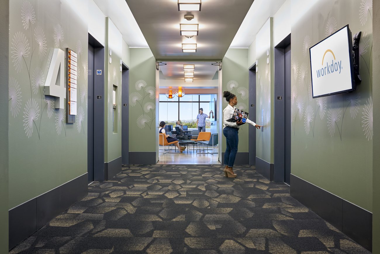 Workday purchased the former Safeway Headquarters building to create their own HQ. The inspiration of the design was the journey of the company from an idea sketched out in a diner in Truckee through their current iteration and the project of building out a headquarters building. The journey is shown through the changes in the flooring patterns and the colors of each space as you progress up and through the building.
