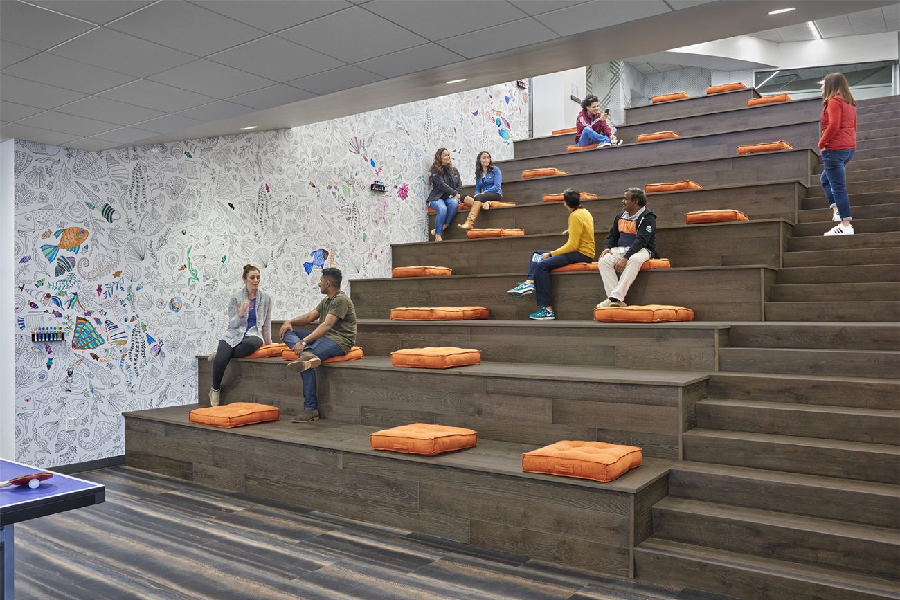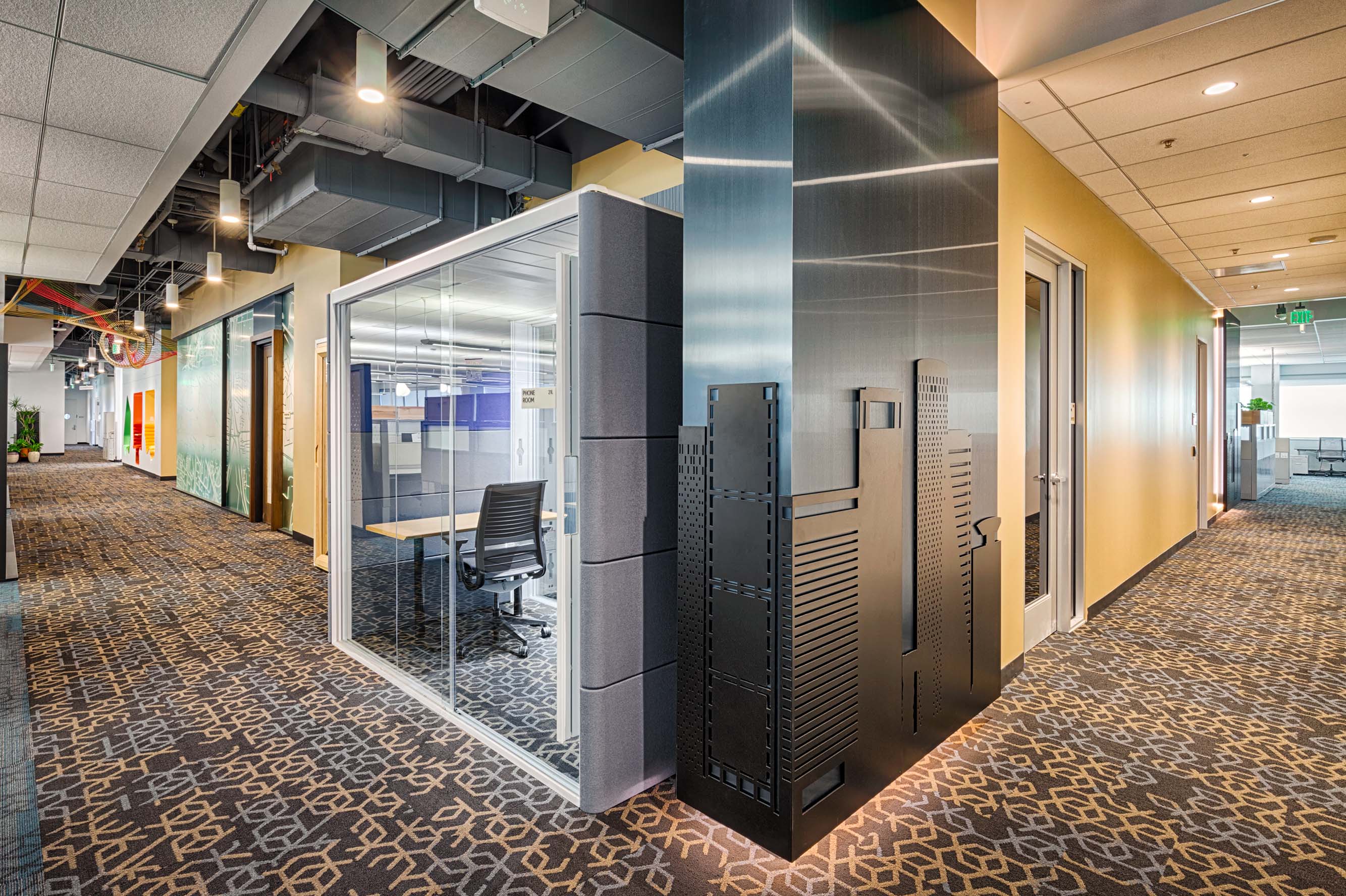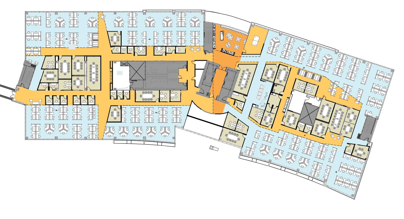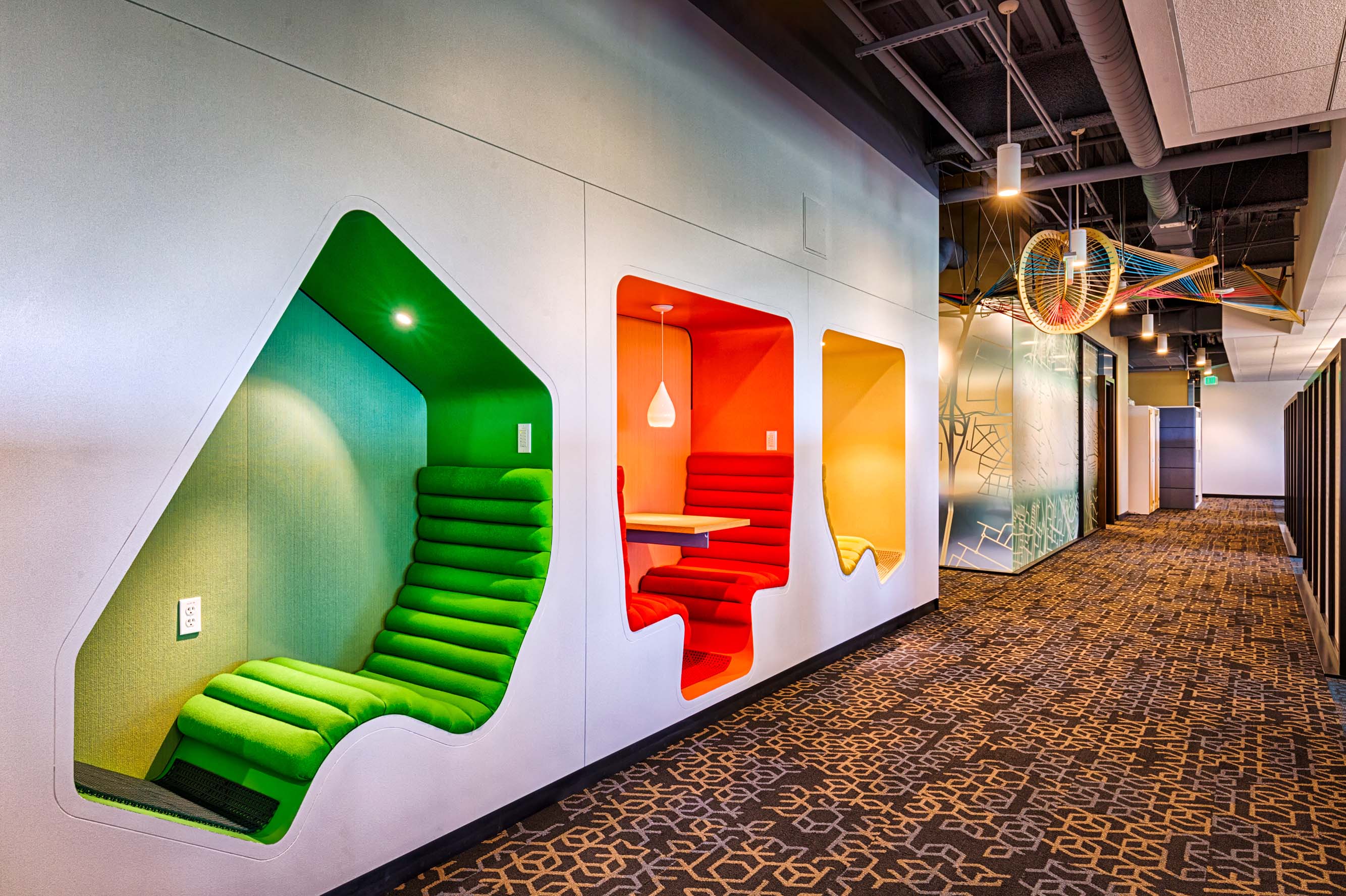 Workday purchased the former Safeway Headquarters building to create their own HQ. The inspiration of the design was the journey of the company from an idea sketched out in a diner in Truckee through their current iteration and the project of building out a headquarters building. The journey is shown through the changes in the flooring patterns and the colors of each space as you progress up and through the building.