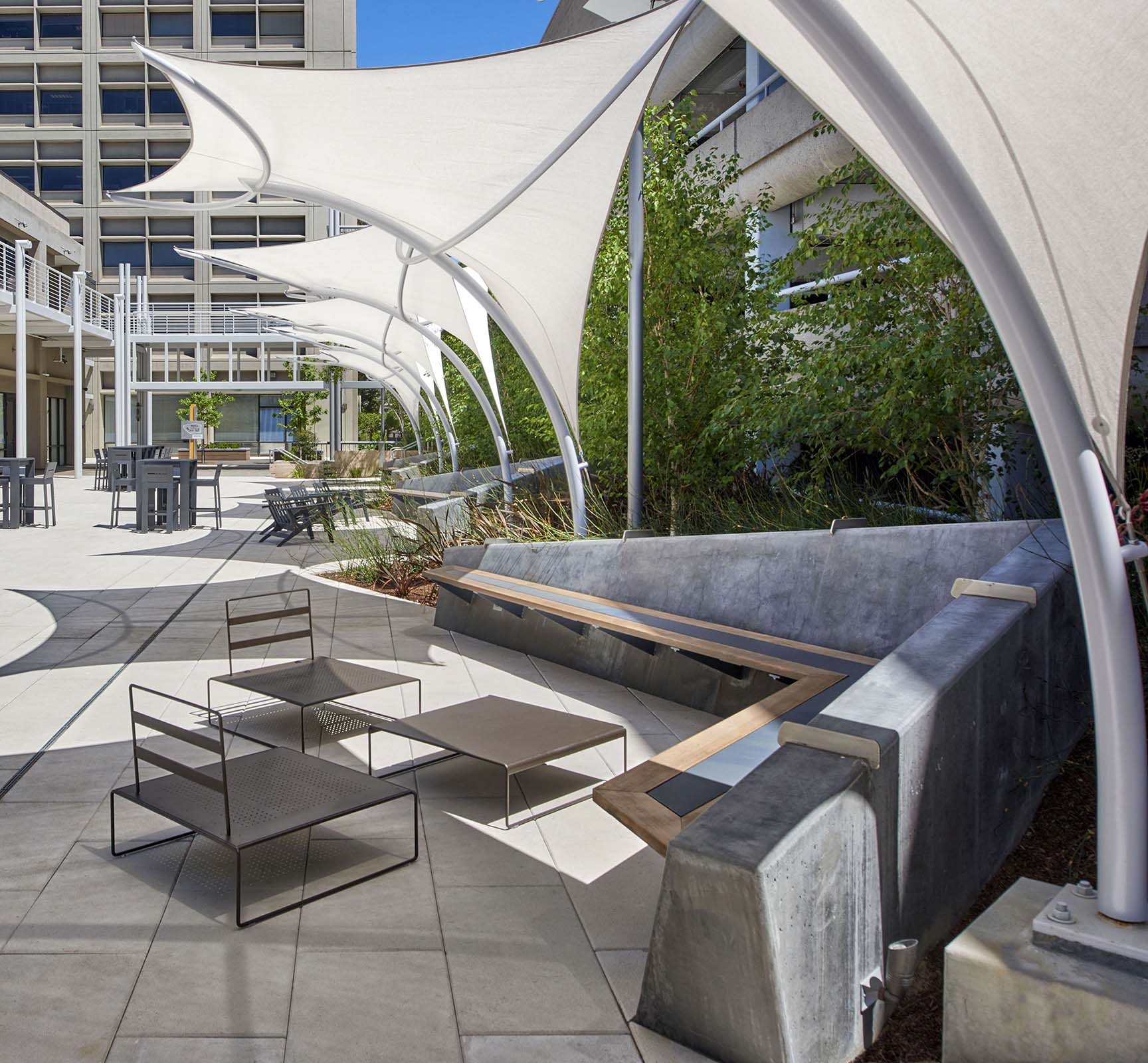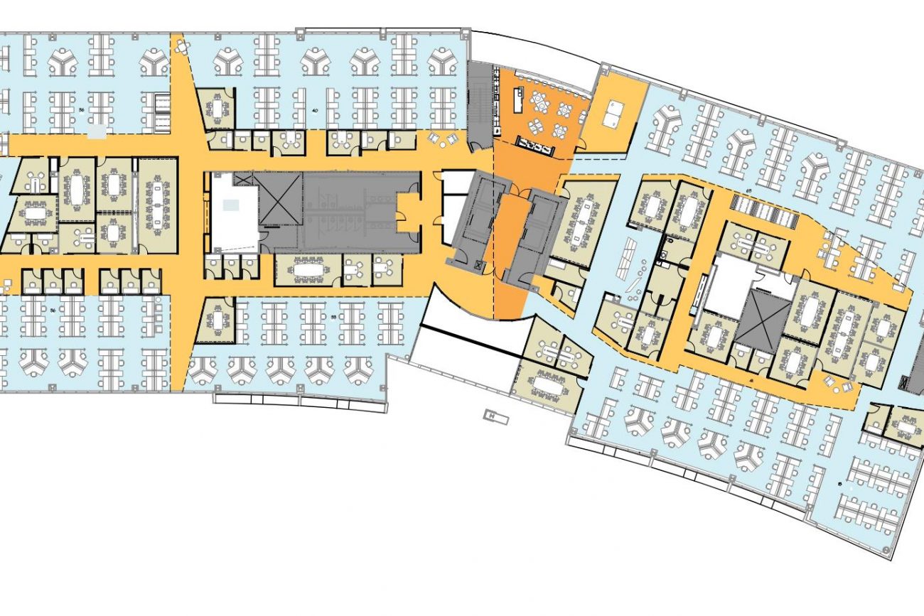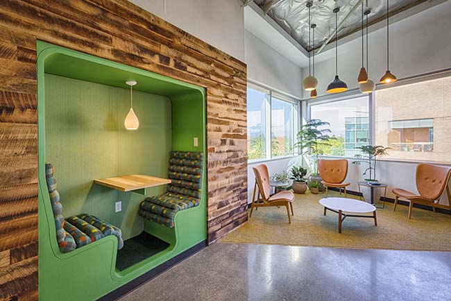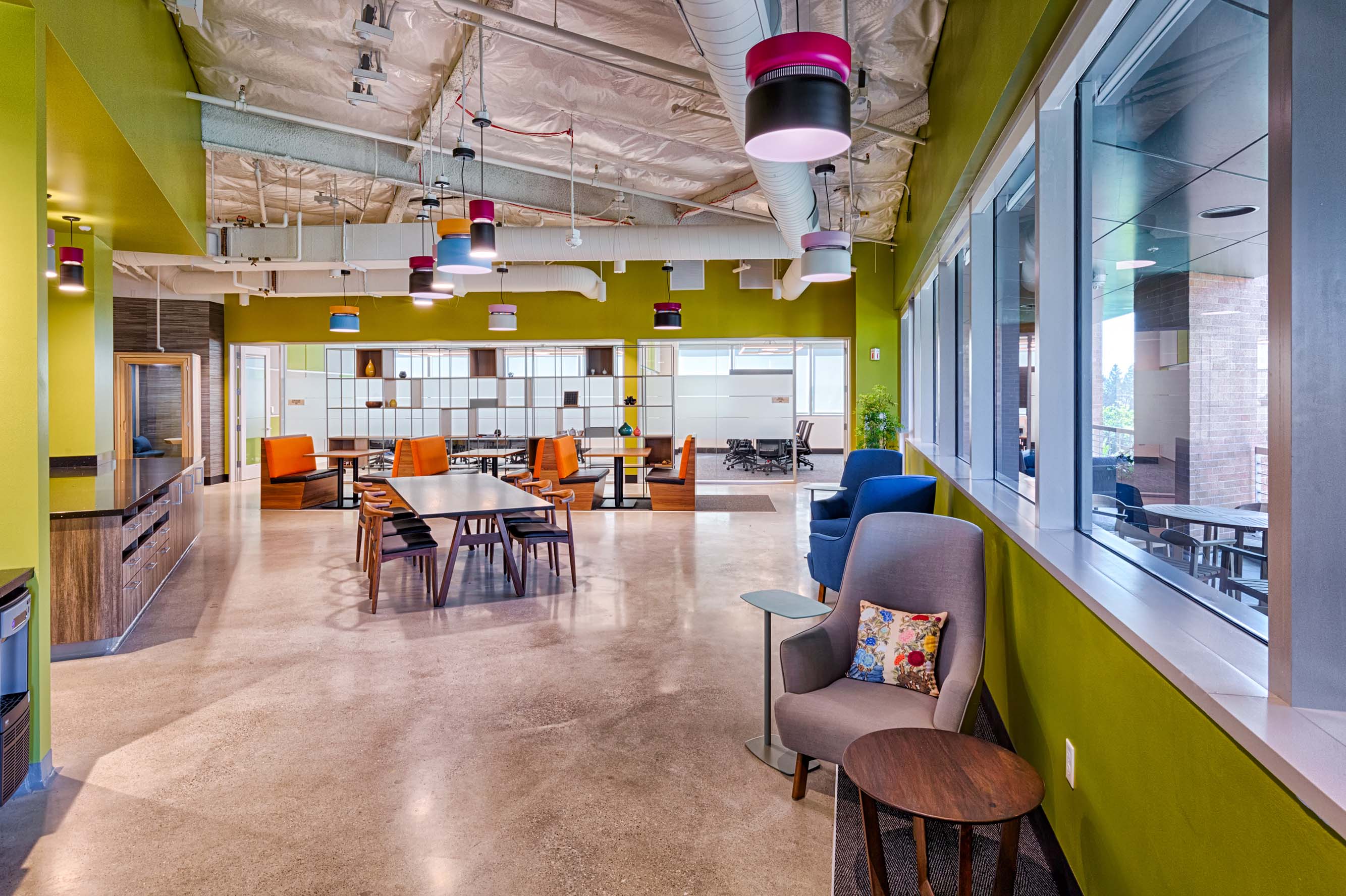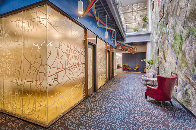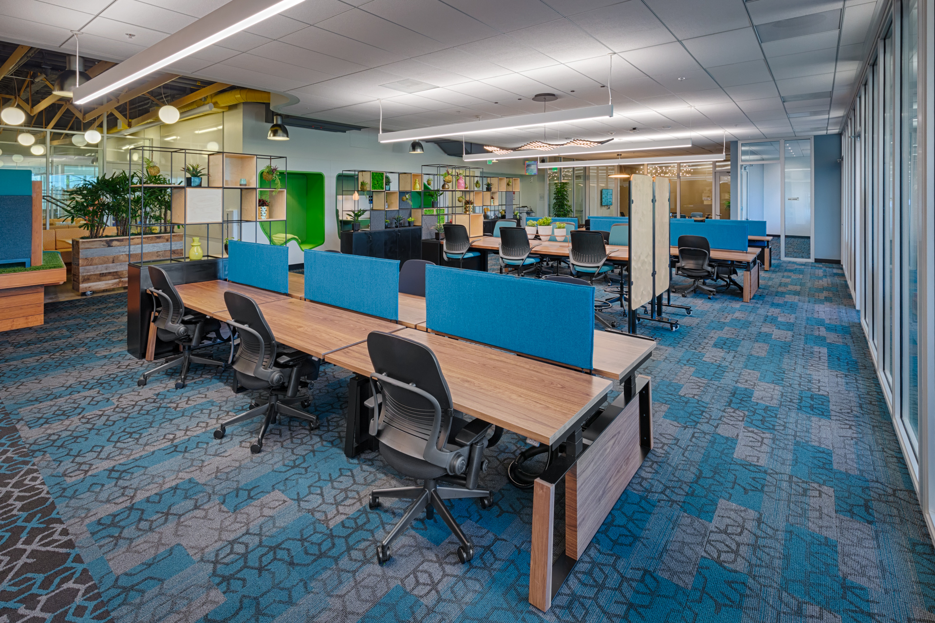Workday purchased the former Safeway Headquarters building to create their own HQ. The inspiration of the design was the journey of the company from an idea sketched out in a diner in Truckee through their current iteration and the project of building out a headquarters building. The journey is shown through the changes in the flooring patterns and the colors of each space as you progress up and through the building.