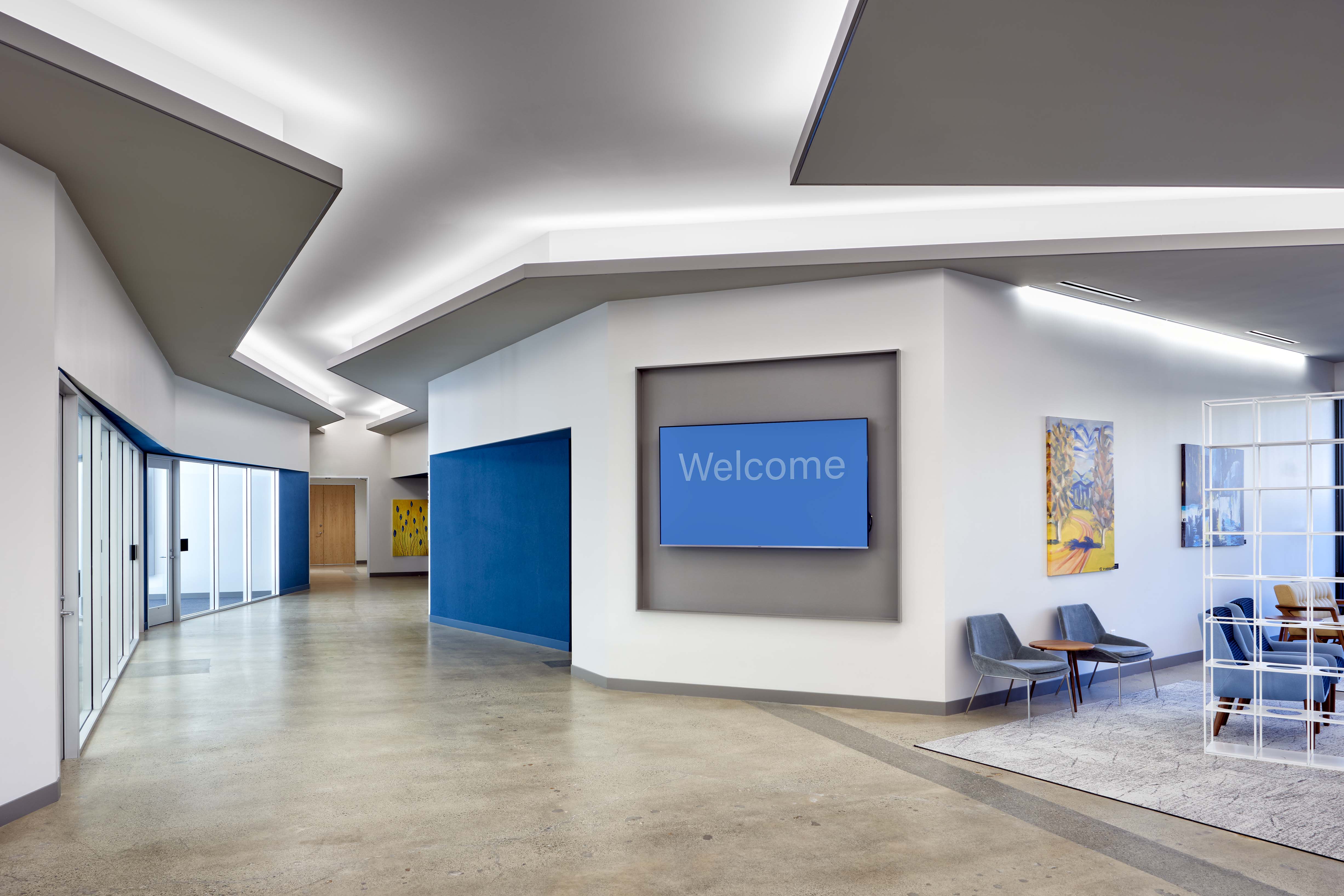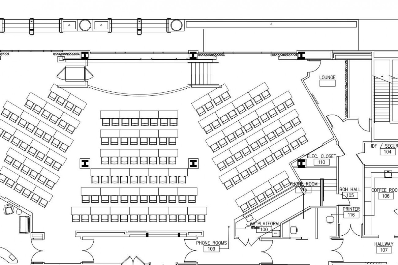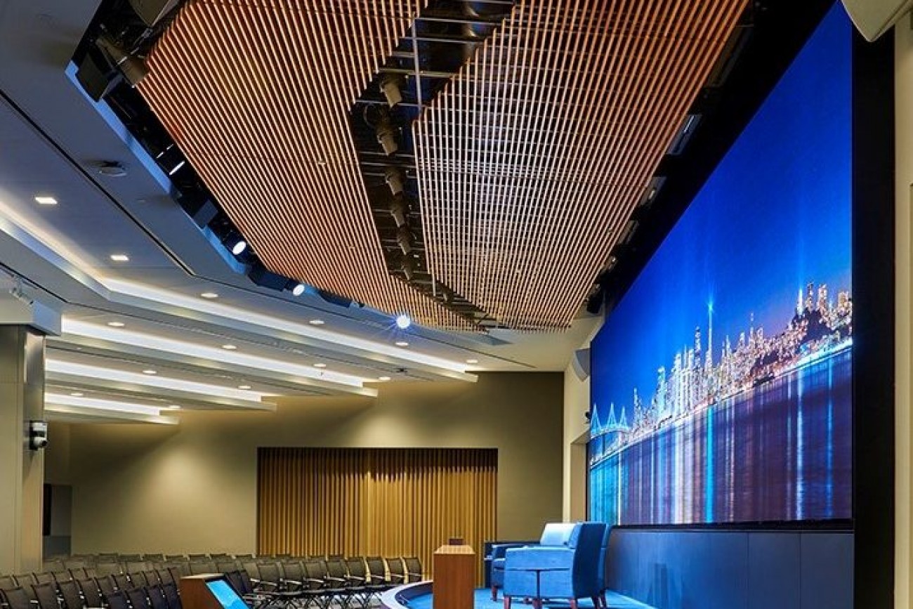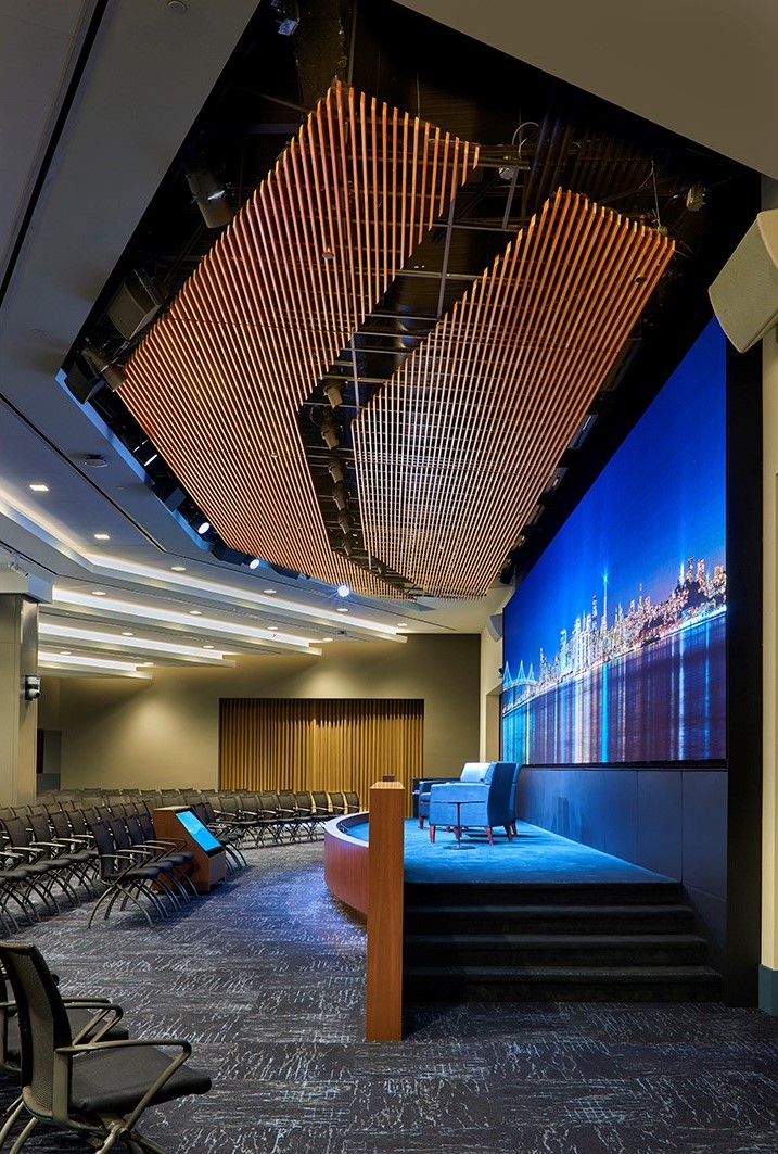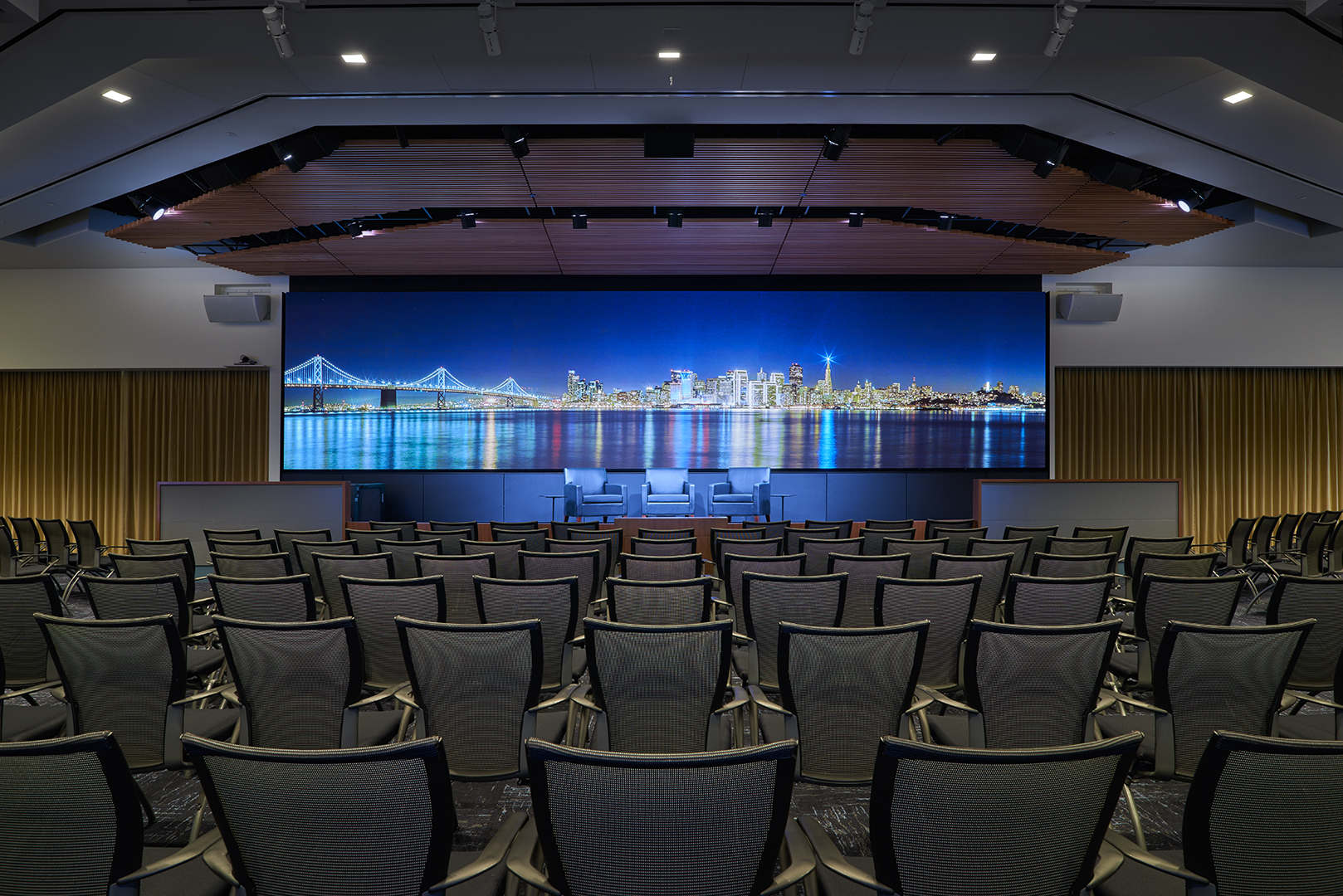 A renovation of an existing auditorium to accommodate the latest large-format LED screen technology. The auditorium was also upgraded to accommodate company-wide conference space and to look and feel more useful for external rental for other events. The look and feel inspiration for this project, especially for the ceiling, is a tribute to the local grand movie palaces of the 1920s.