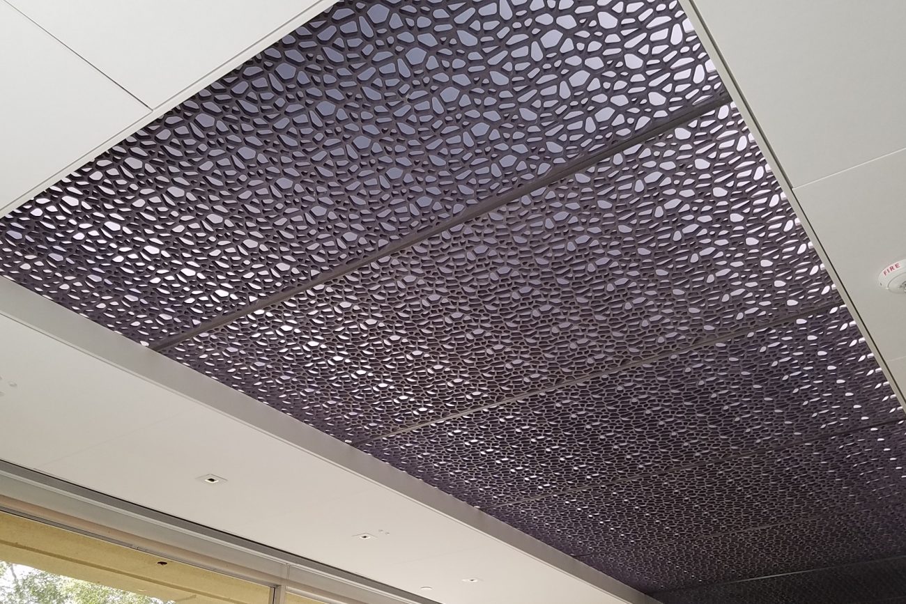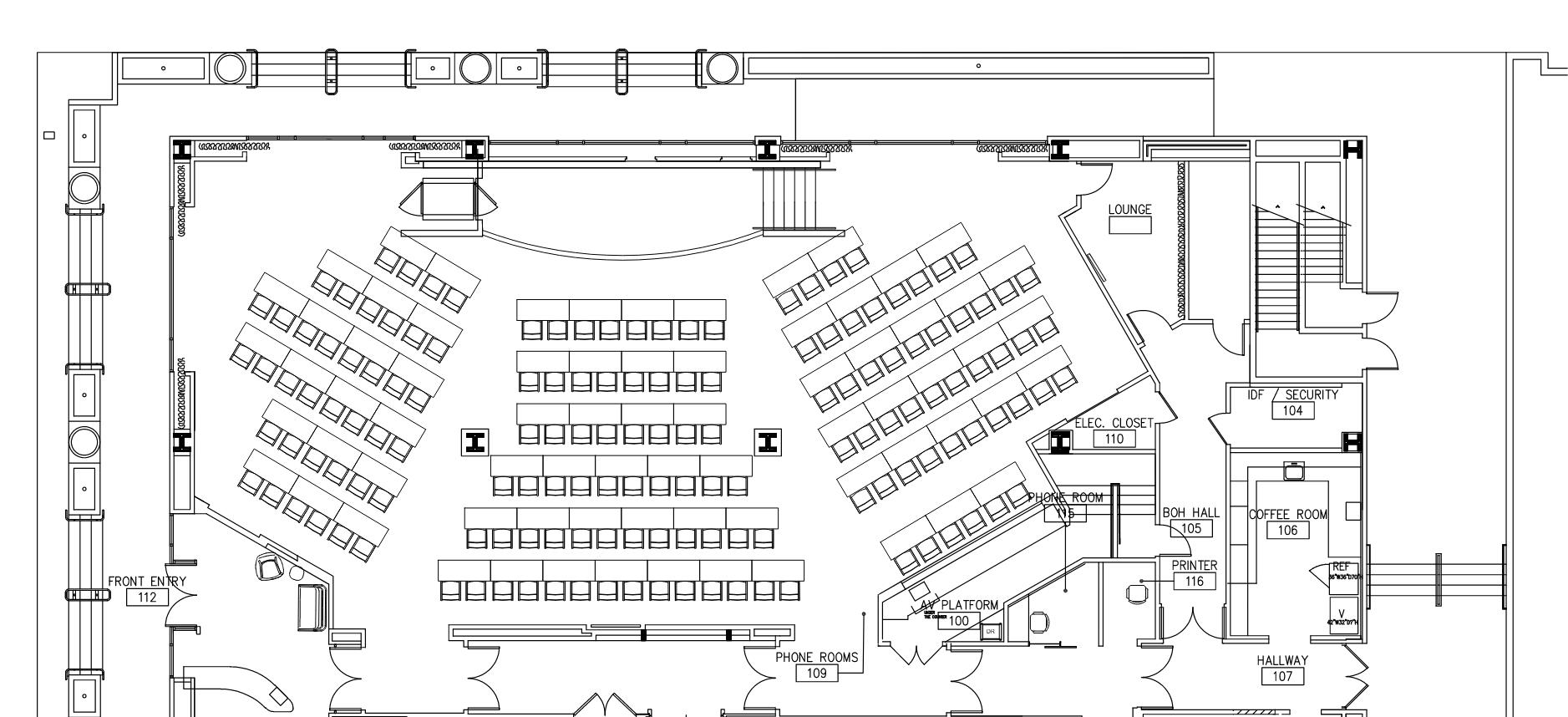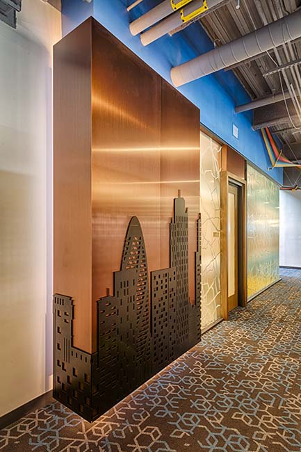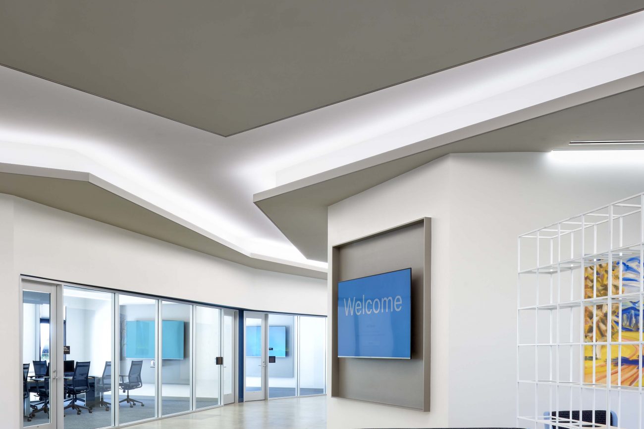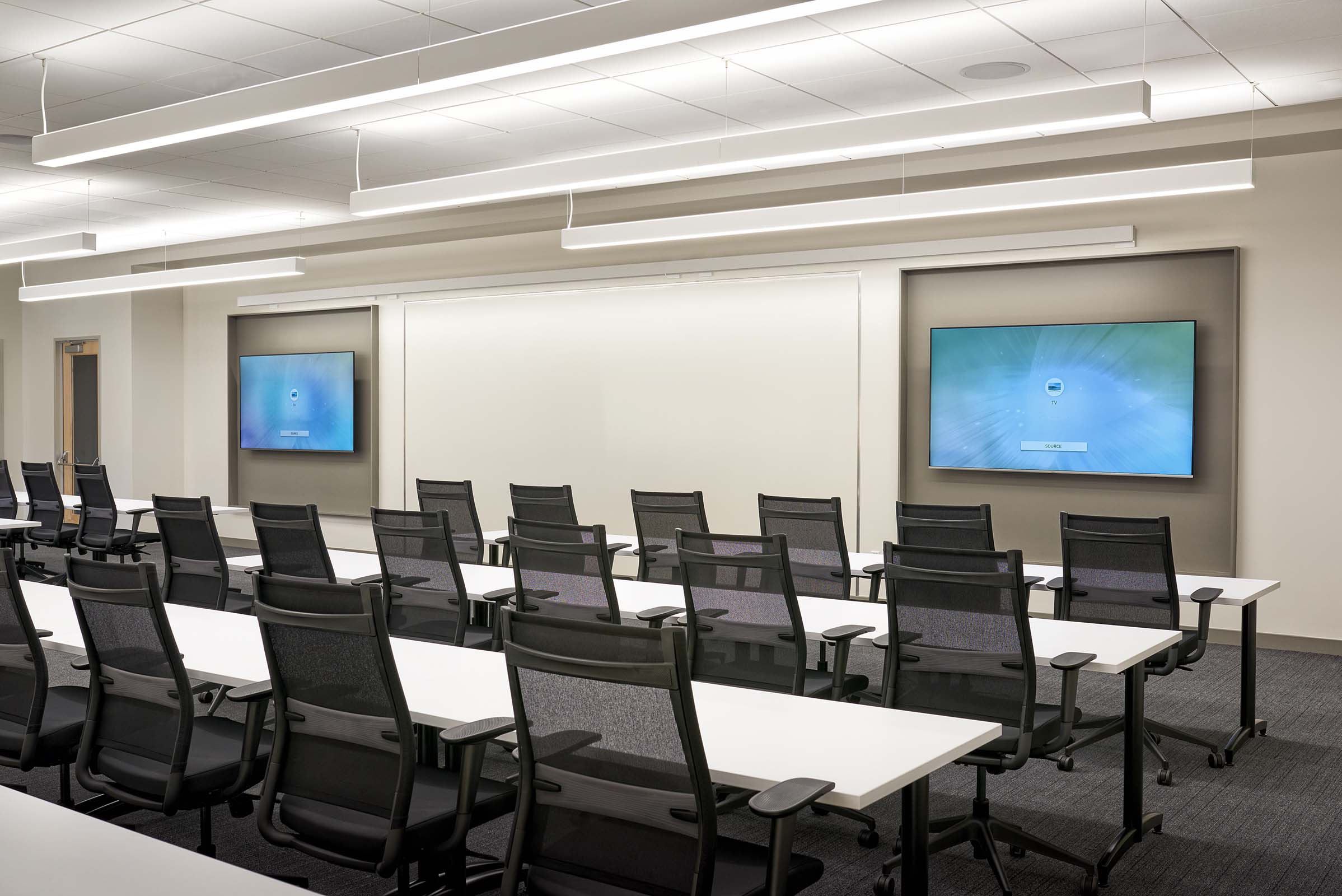 A renovation of an existing auditorium to accommodate the latest large-format LED screen technology. The auditorium was also upgraded to accommodate company-wide conference space and to look and feel more useful for external rental for other events. The look and feel inspiration for this project, especially for the ceiling, is a tribute to the local grand movie palaces of the 1920s.