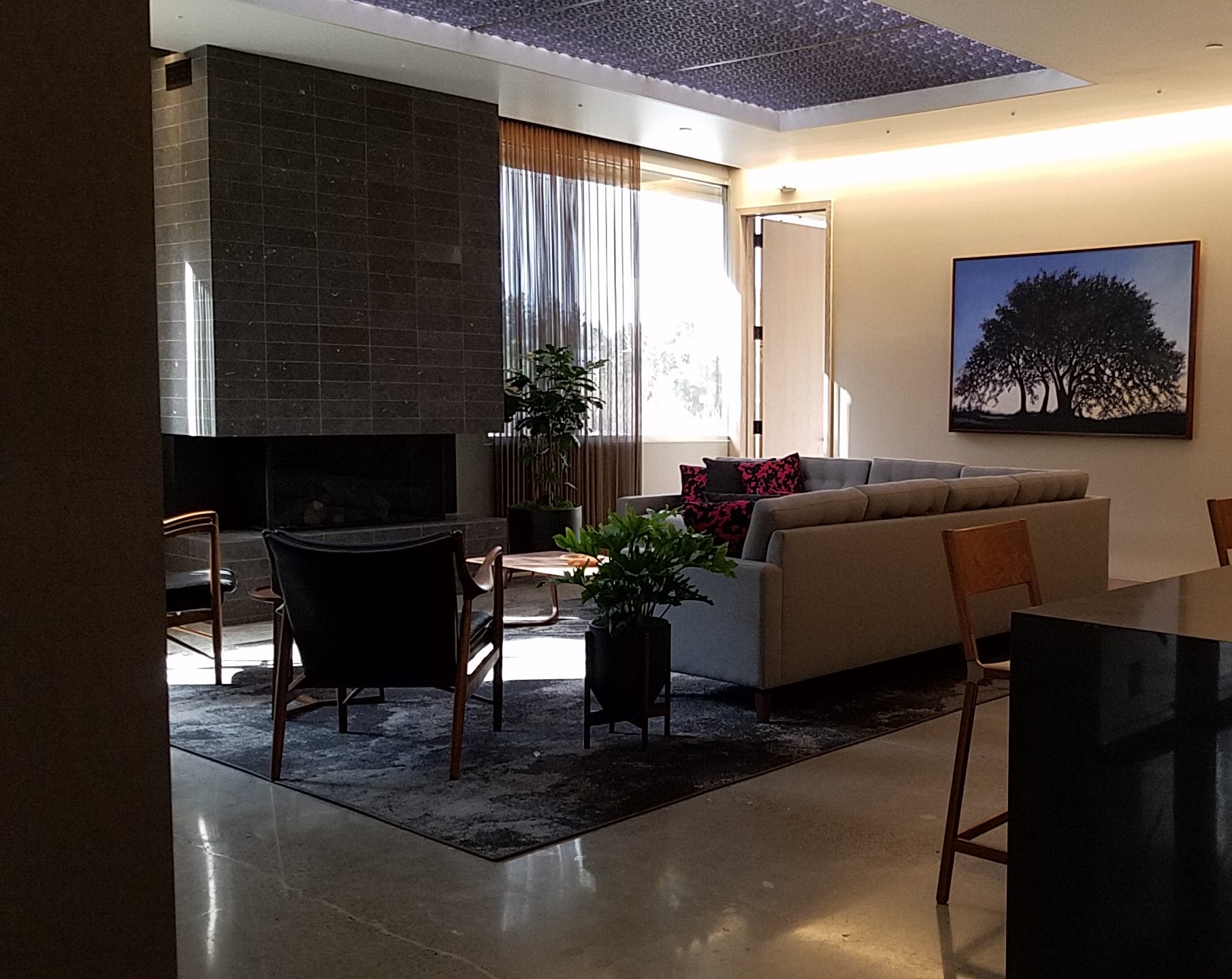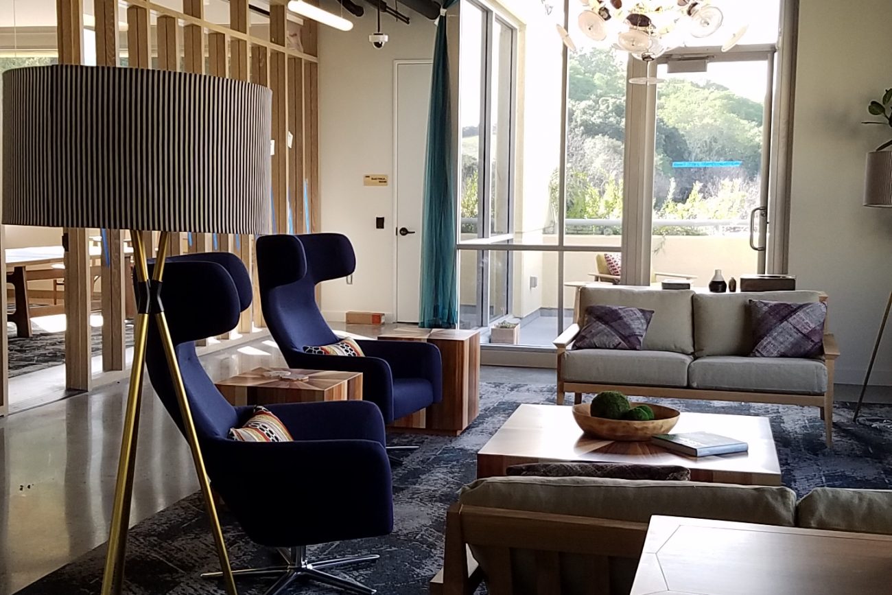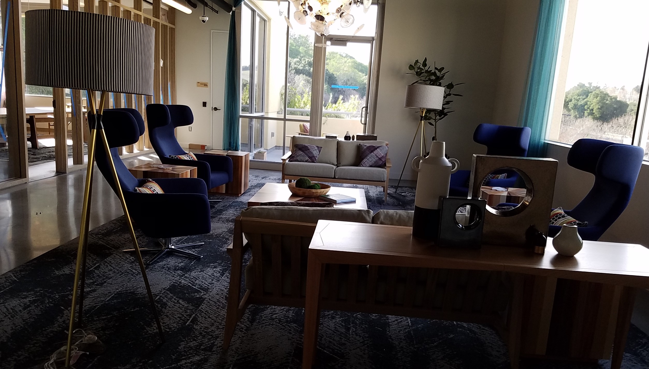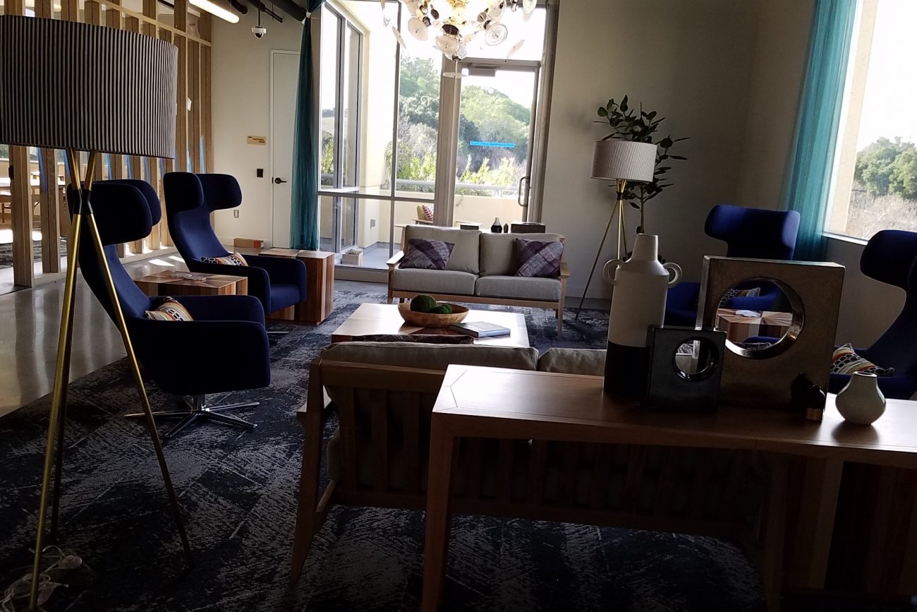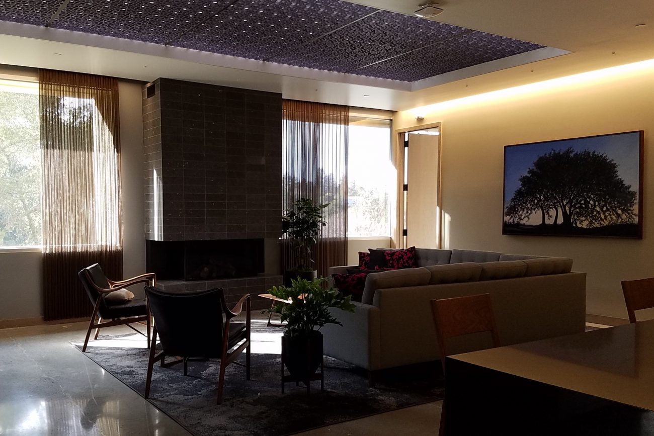 An executive suite for the CEO of a major tech company that is located away from the company’s main campus to provide a private and quiet space for working and entertainment plus quarterly board meetings. The inspiration for the space was the view of the rolling hills visible from the office and balcony, and the changes that the seasons bring to the hills of Northern California. The space had an executive office with an adjacent transition [Office1] room for emergencies, plus an adjacent large conference room, a phone room, and in the front of the office, a private shower and bathroom. This all flowed into a lounge and micro kitchen for providing catering for the large conference room. A fireplace in the lounge gives the space an intimate, residential feel to the space. There is an adjacent security office, with restrooms for guests. Next to this space is a “greenroom/boardroom” that is used for quarterly board of directors’ meetings with an adjacent dining room, lounge area for entertainment and a catering kitchen.