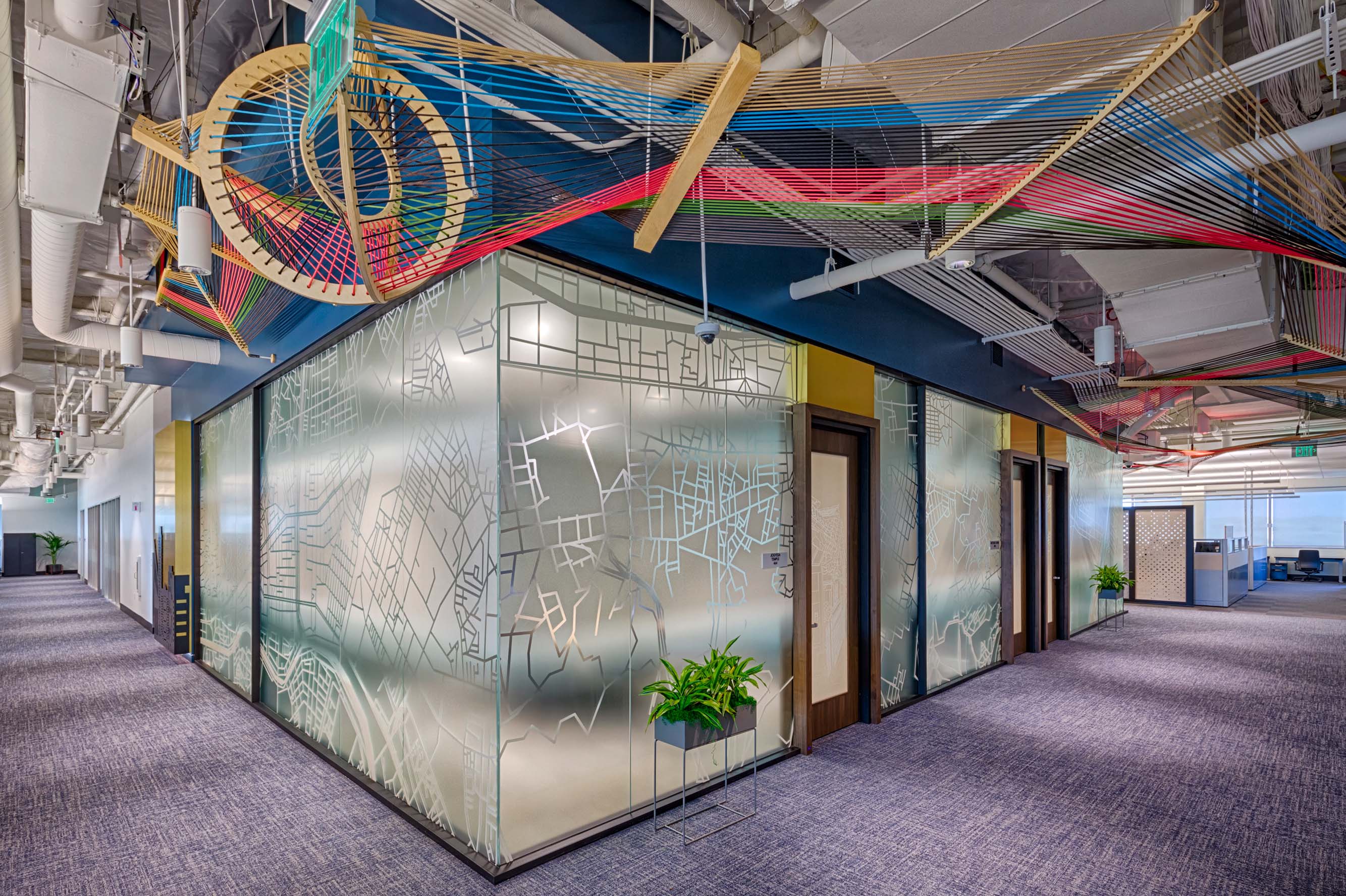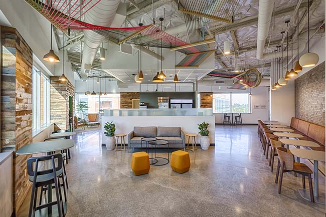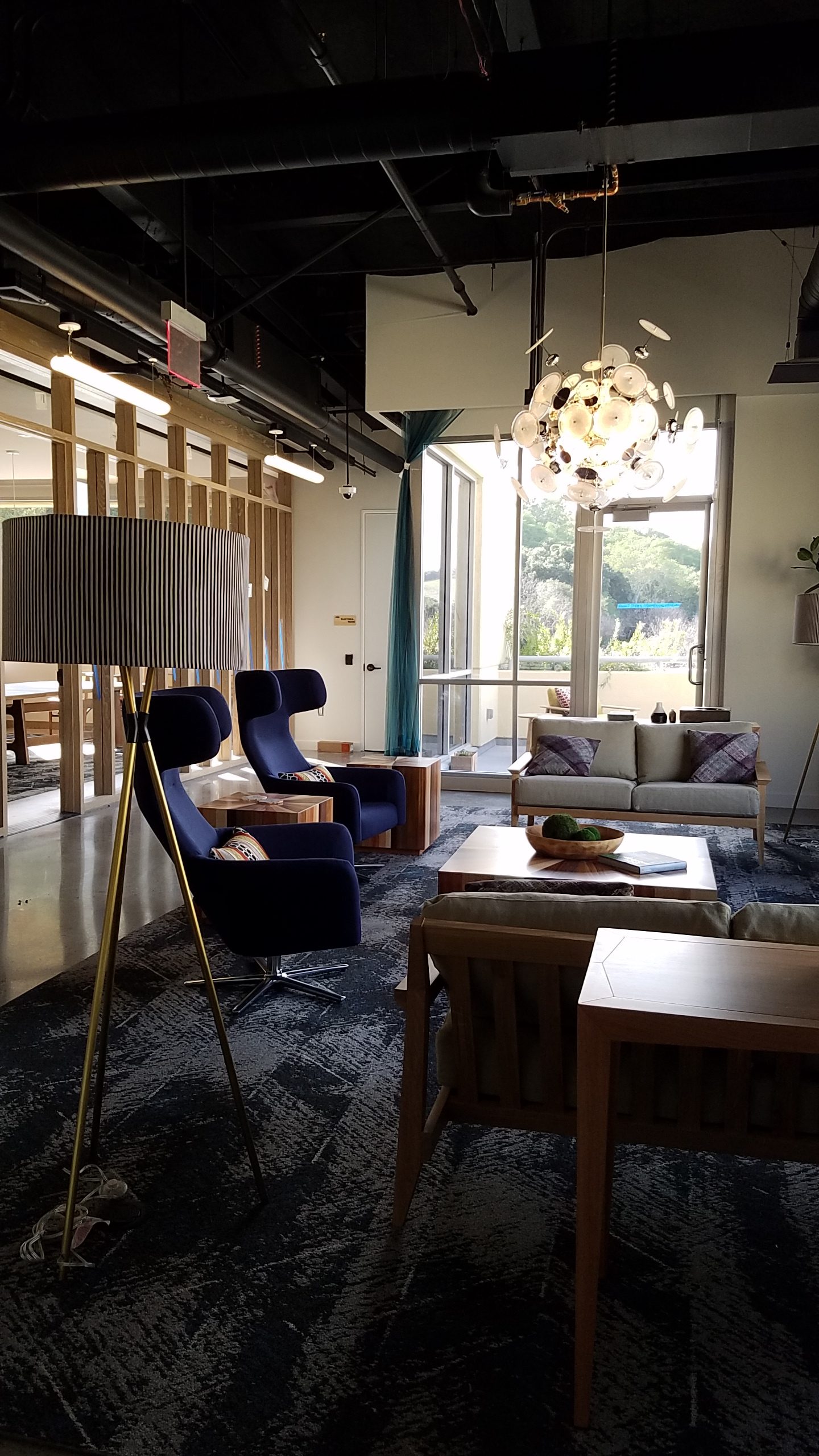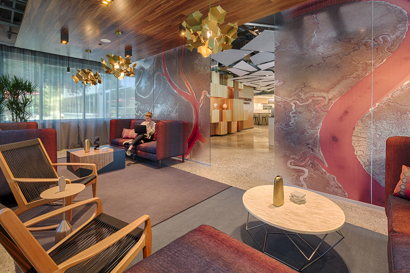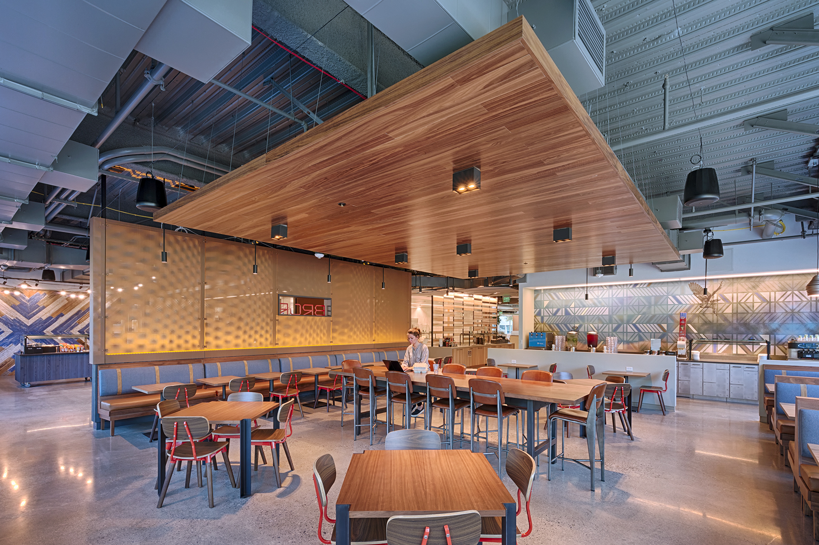 A renovation of an existing 30,000 ground floor space for this hi-tech company to add a reception, gym conference center, and large cafe. This project was awarded the "2019 Silicon Valley Large Commercial Interiors of Year". Using the inspiration of the site which was originally Salt Ponds on the San Francisco Bay. Using the history and characteristics of the sea salt work on the bay with the bright colors from the salinity levels and microorganisms from the ponds creating a journey from the reception throughout fitness center, conference center, and cafe of the changes to the salt ponds and bay of the last 200 years.
