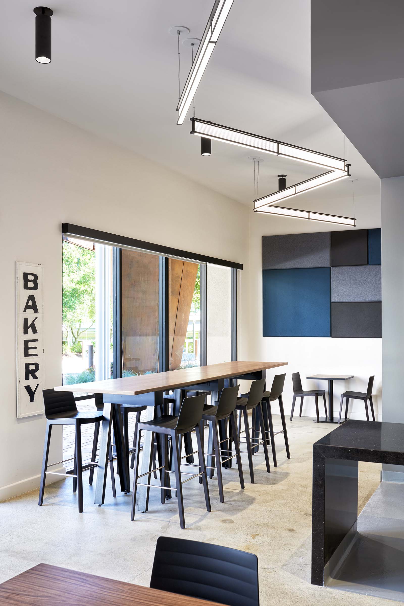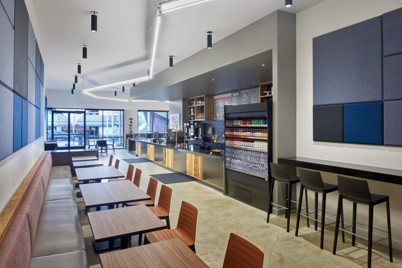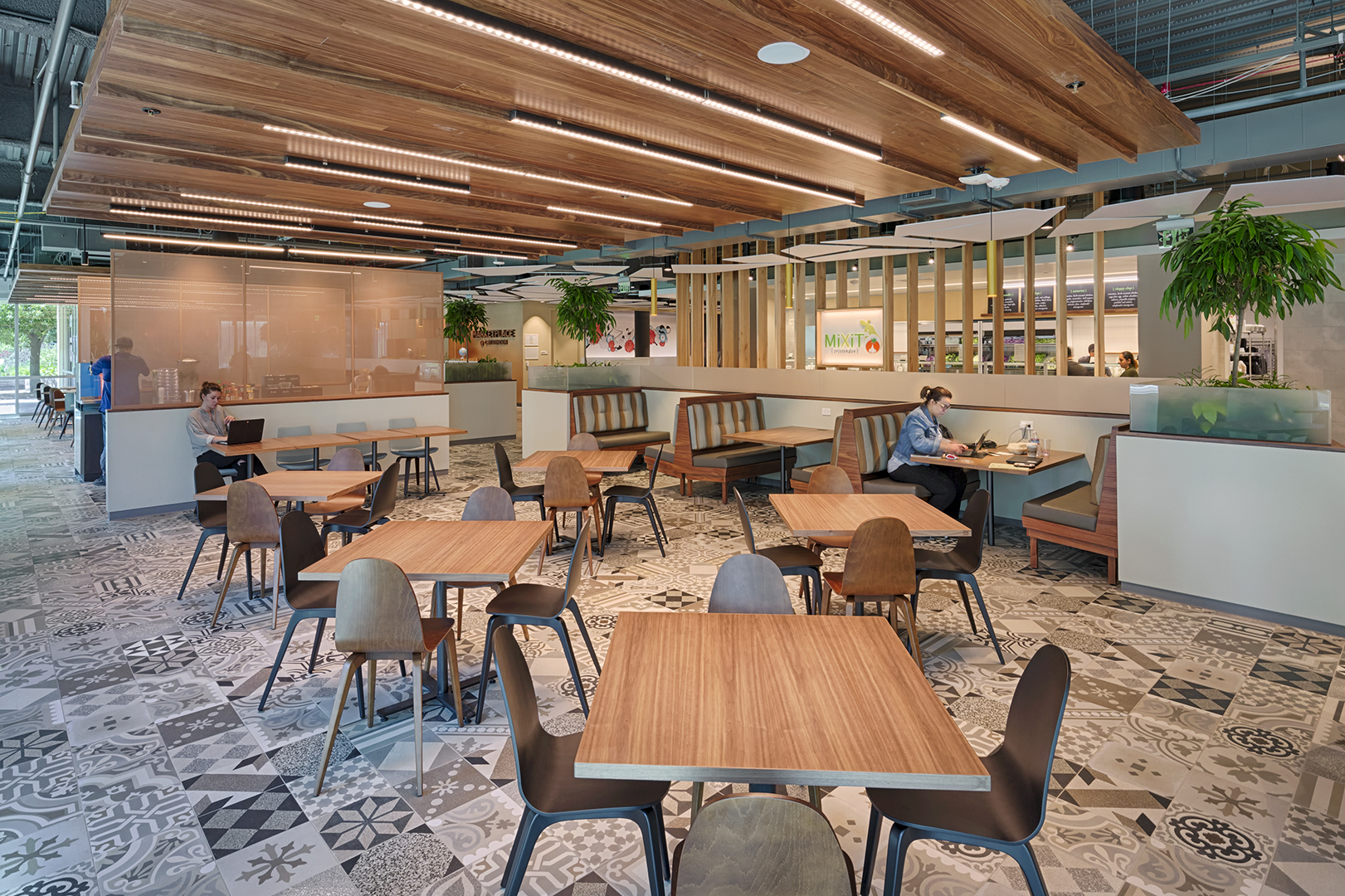A renovation of an existing 30,000 ground floor space for this hi-tech company to add a reception, gym conference center, and large cafe. This project was awarded the "2019 Silicon Valley Large Commercial Interiors of Year". Using the inspiration of the site which was originally Salt Ponds on the San Francisco Bay. Using the history and characteristics of the sea salt work on the bay with the bright colors from the salinity levels and microorganisms from the ponds creating a journey from the reception throughout fitness center, conference center, and cafe of the changes to the salt ponds and bay of the last 200 years.