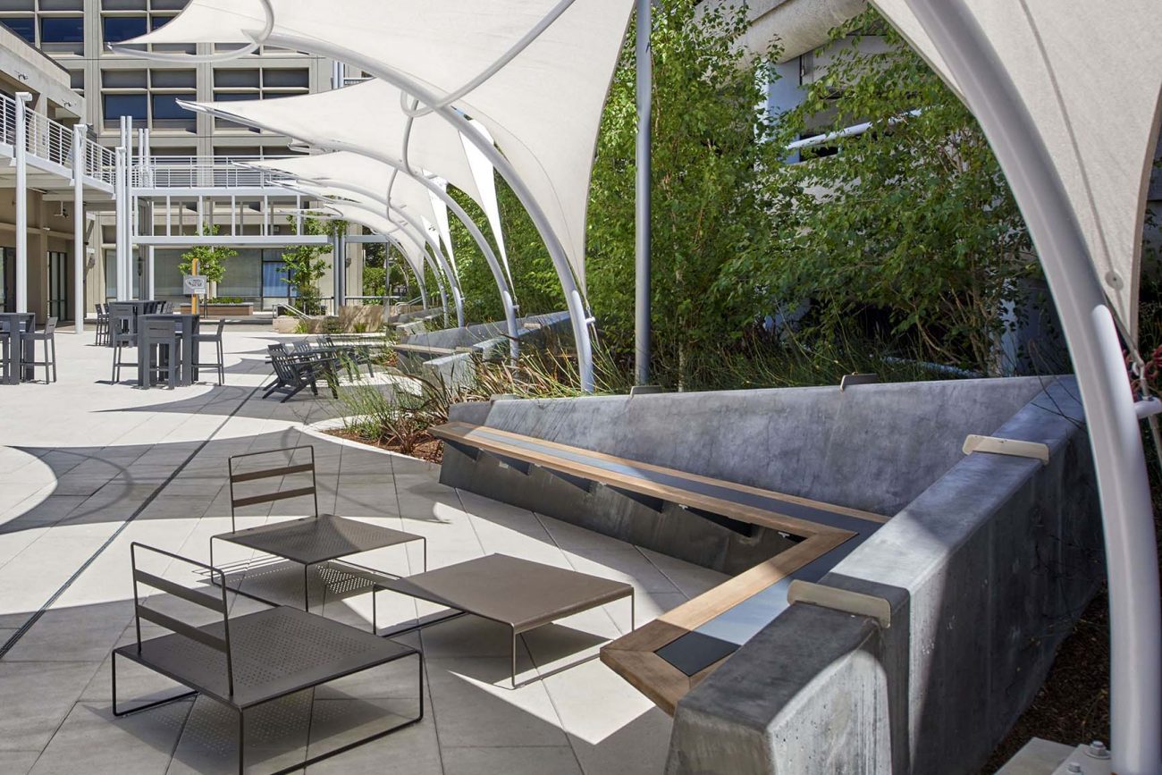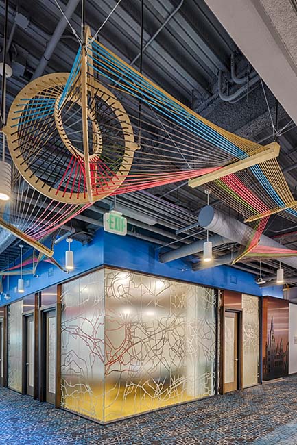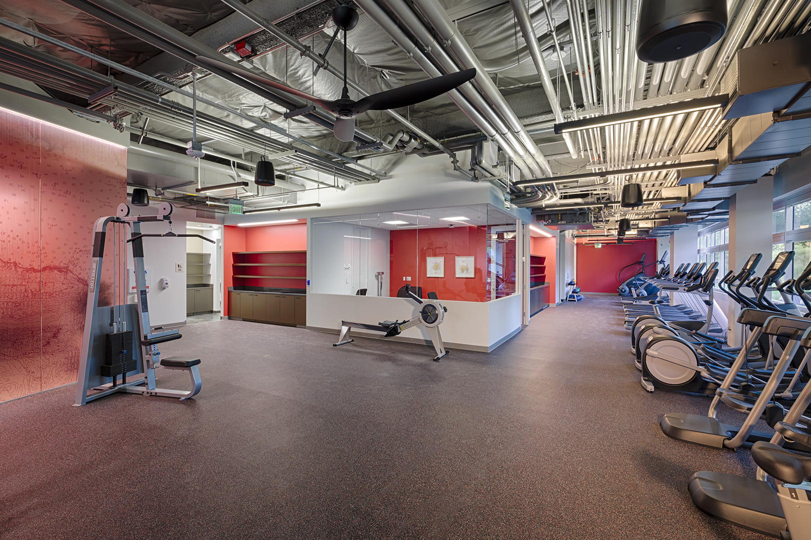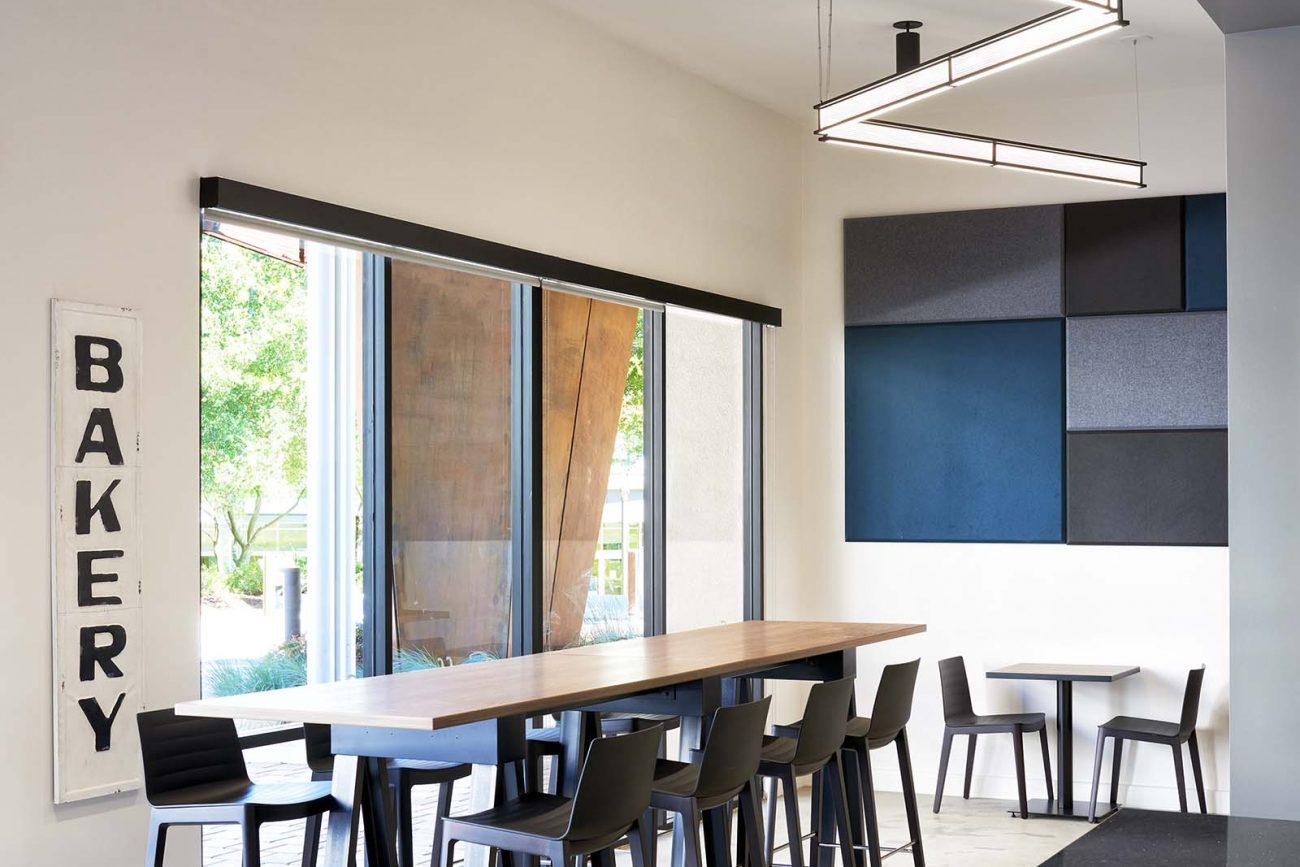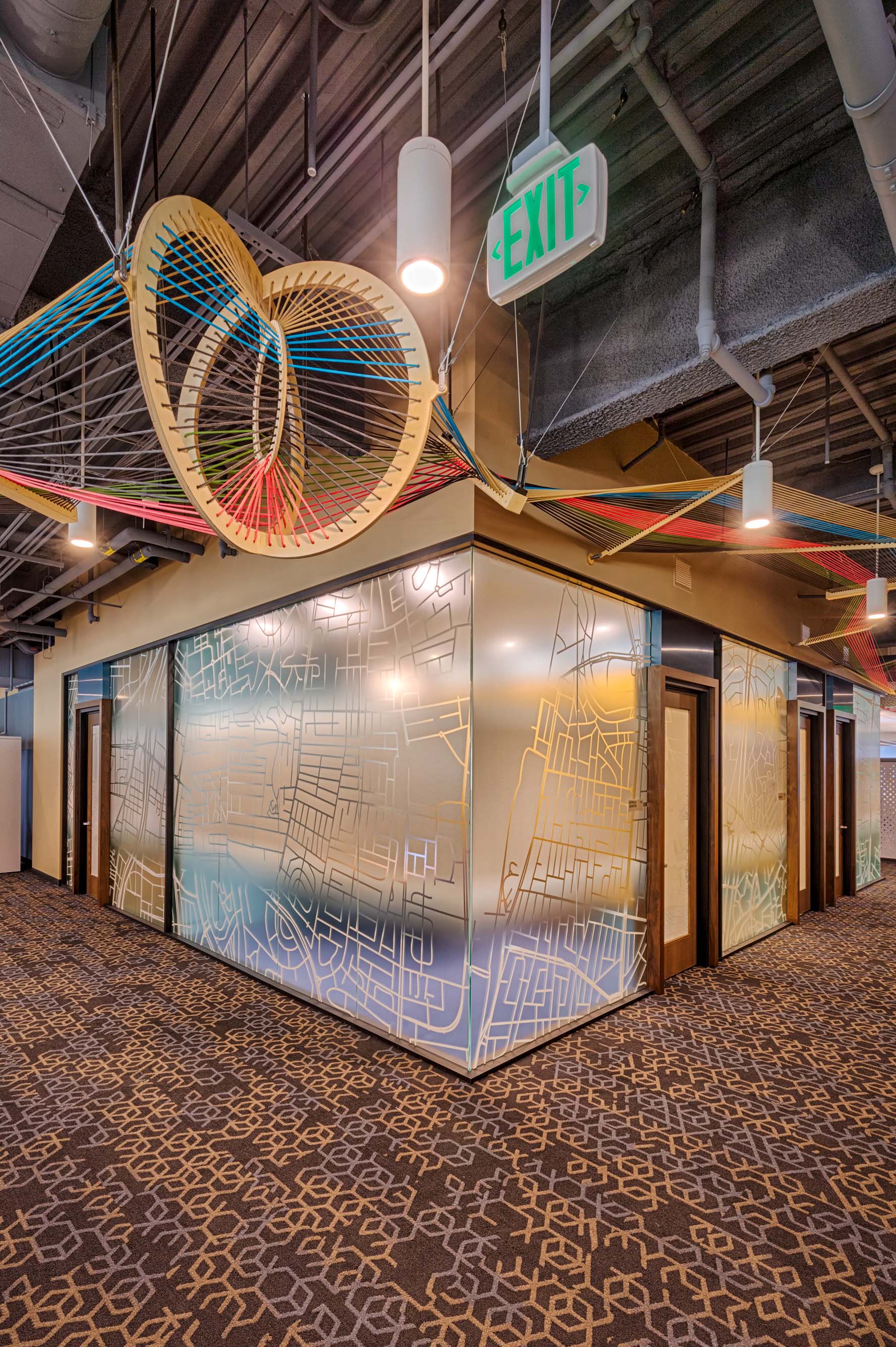 A renovation of an existing 30,000 ground floor space for this hi-tech company to add a reception, gym conference center, and large cafe. This project was awarded the "2019 Silicon Valley Large Commercial Interiors of Year". Using the inspiration of the site which was originally Salt Ponds on the San Francisco Bay. Using the history and characteristics of the sea salt work on the bay with the bright colors from the salinity levels and microorganisms from the ponds creating a journey from the reception throughout fitness center, conference center, and cafe of the changes to the salt ponds and bay of the last 200 years.