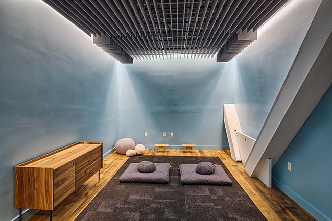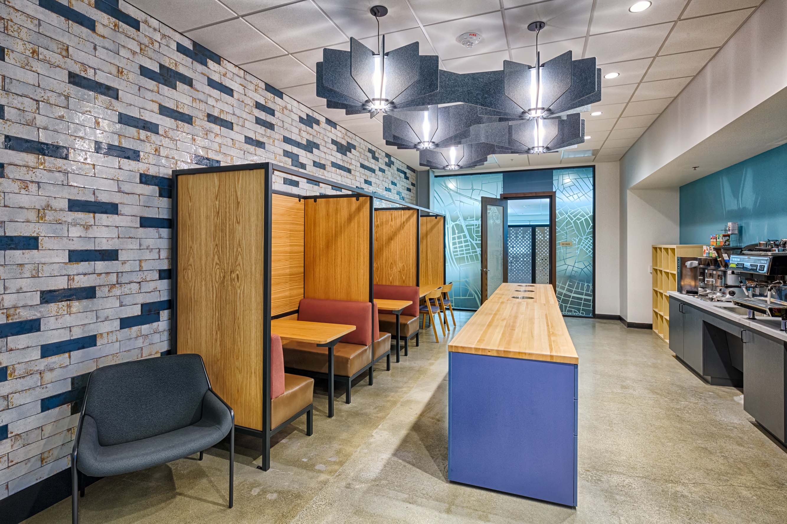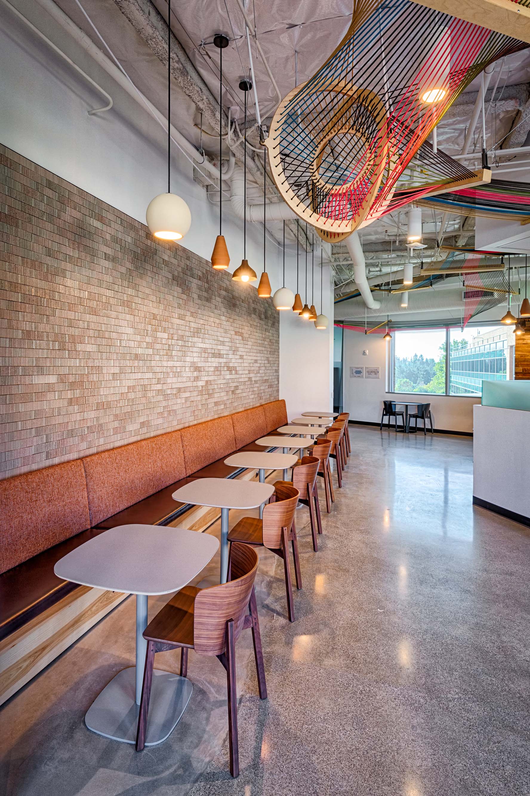 Renovation of existing office space into a community center and cafe for the campus and surrounding community. Inspired by the architecture "Ribbon" concept. Winner of 2021 of the People's Choice Architizer's A+A Award for architectures and interiors.