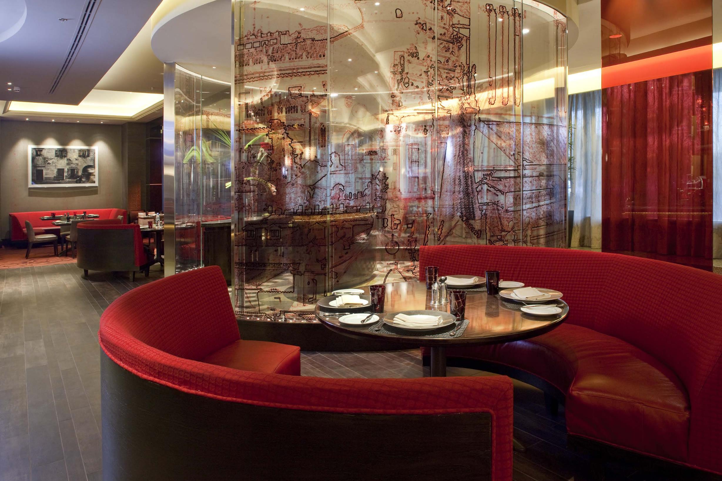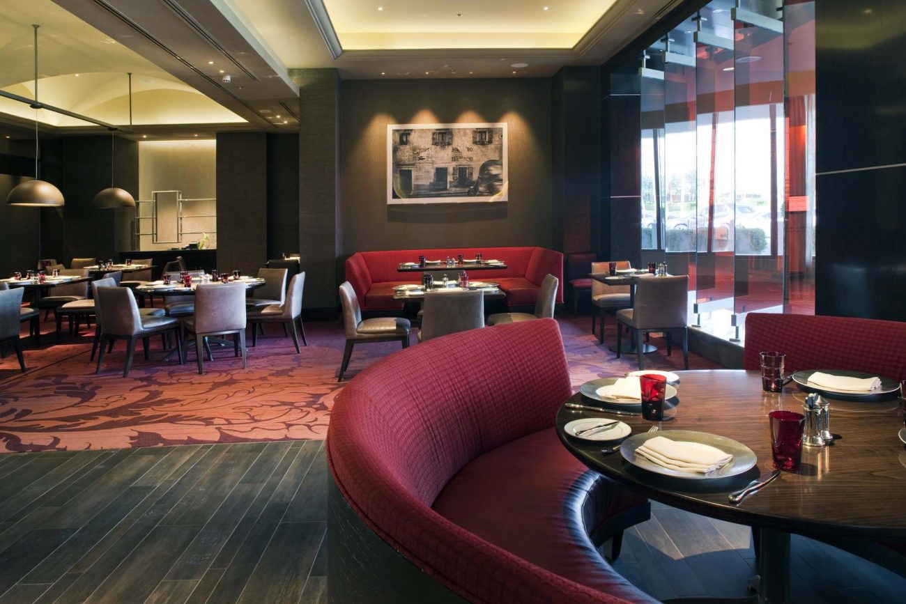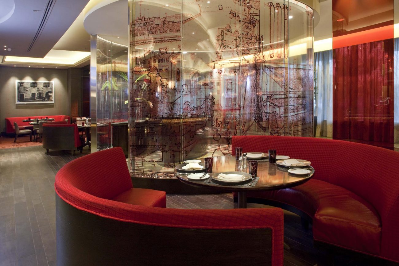 Rosso, the hotel’s formal Italian restaurant, was updated to be anchored with a center antipasto bar surrounded by different dining room areas, the family area and man’s dining area as required by local traditions, and a special larger dining table for group and events. The look and feel of the restaurant draws inspiration from the city of Rome and it’s renown as the center of the Italian film world.