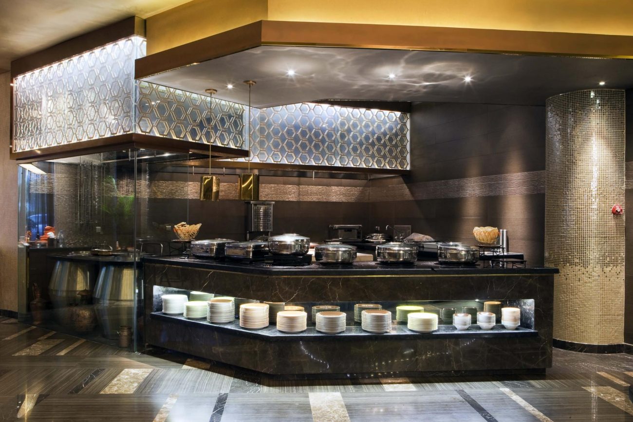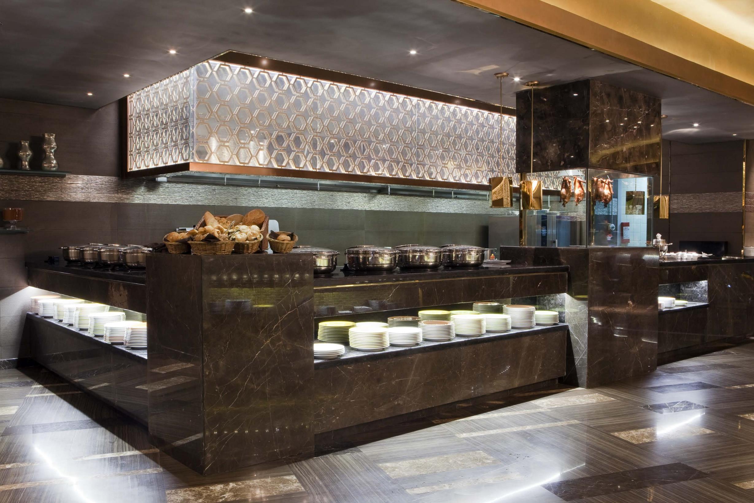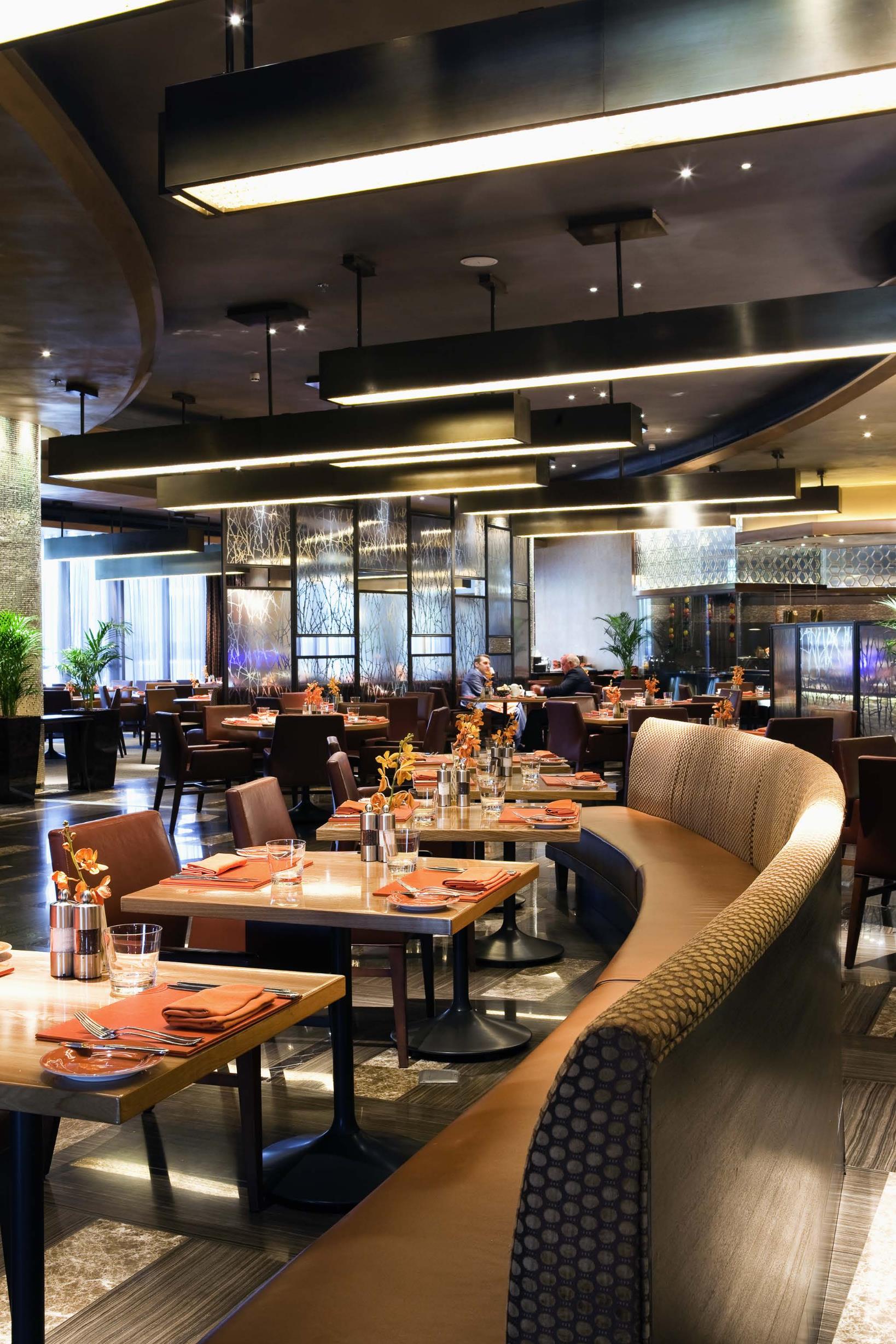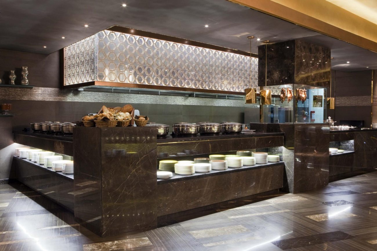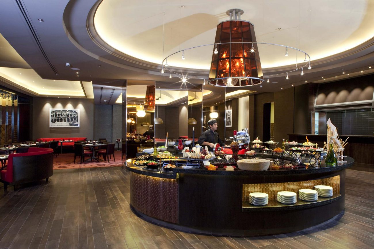 Our remit was to refresh the two hotel restaurants in order to accommodate the growing business and social center of the hotel. Elements, the new buffet restaurant, is an expansion of the original restaurant with a large patisserie and dessert area for afternoon service and take out orders. The design inspiration was traditional Middle Eastern bazaars with each food station having a unique look.
